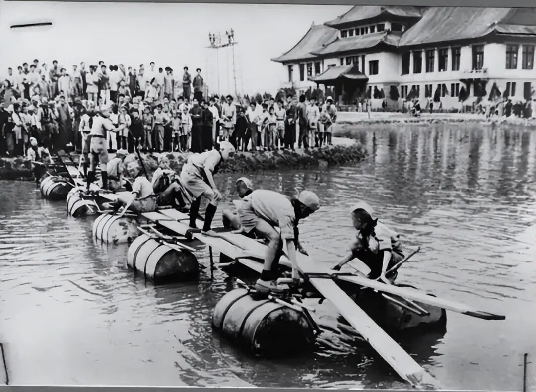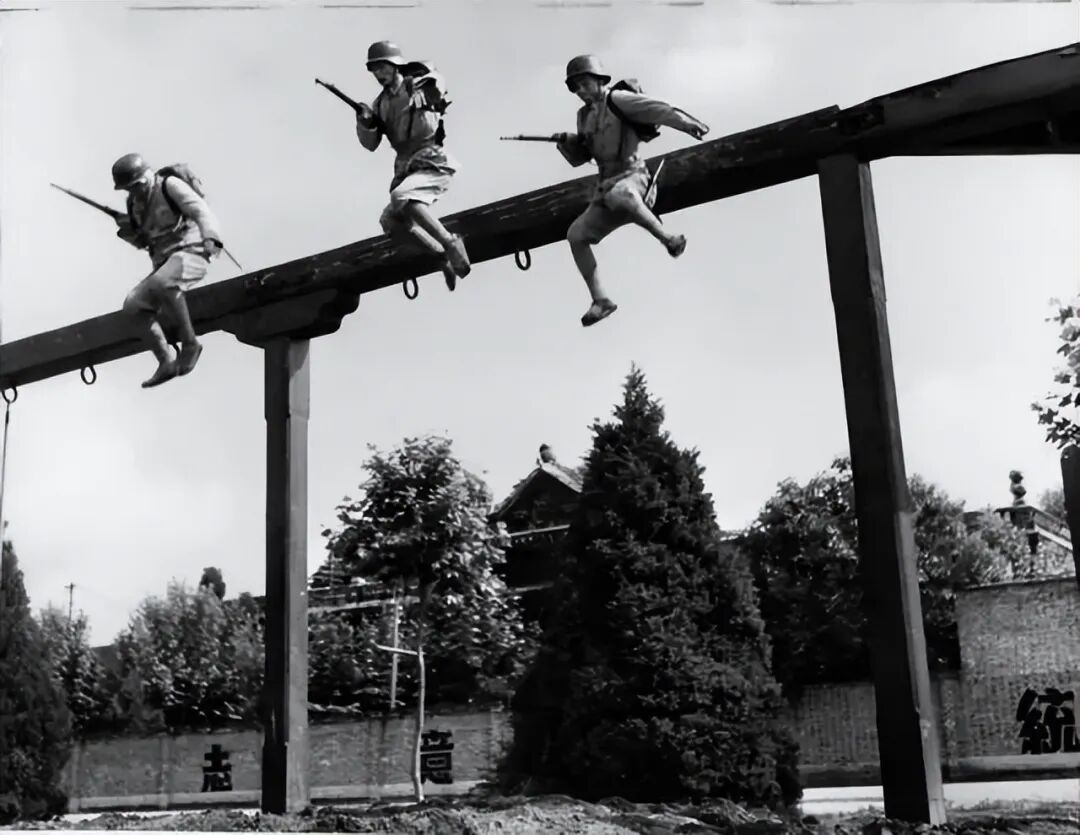 成都中央军校——中国的 “西点” 。学员们跳下一座高桥。