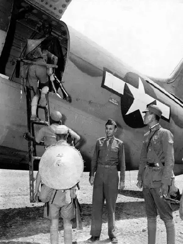 1944年9月6日,威廉·H·皮克斯上校和少霖(音译上尉,一起目送中国第五陆军士兵登上昆明机场的飞机。