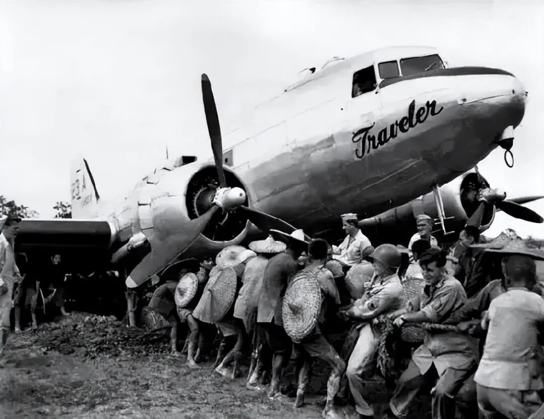 1945年6月13日,广西南宁,一群中国民工和中美士兵携手将一架C-47型运输机拖出一个充满泥浆的炸弹坑,该机场刚刚从日军手中夺取。