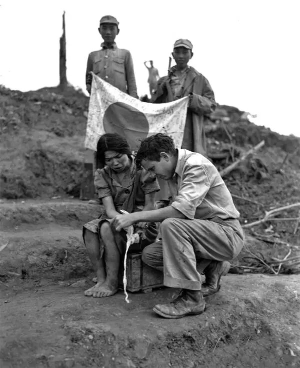 1944年9月7日,云南龙陵县腊勐乡松山,一名美军士兵在给被俘虏的日本女子包扎,背后的两名中国士兵在展示他们缴获的日本军旗。