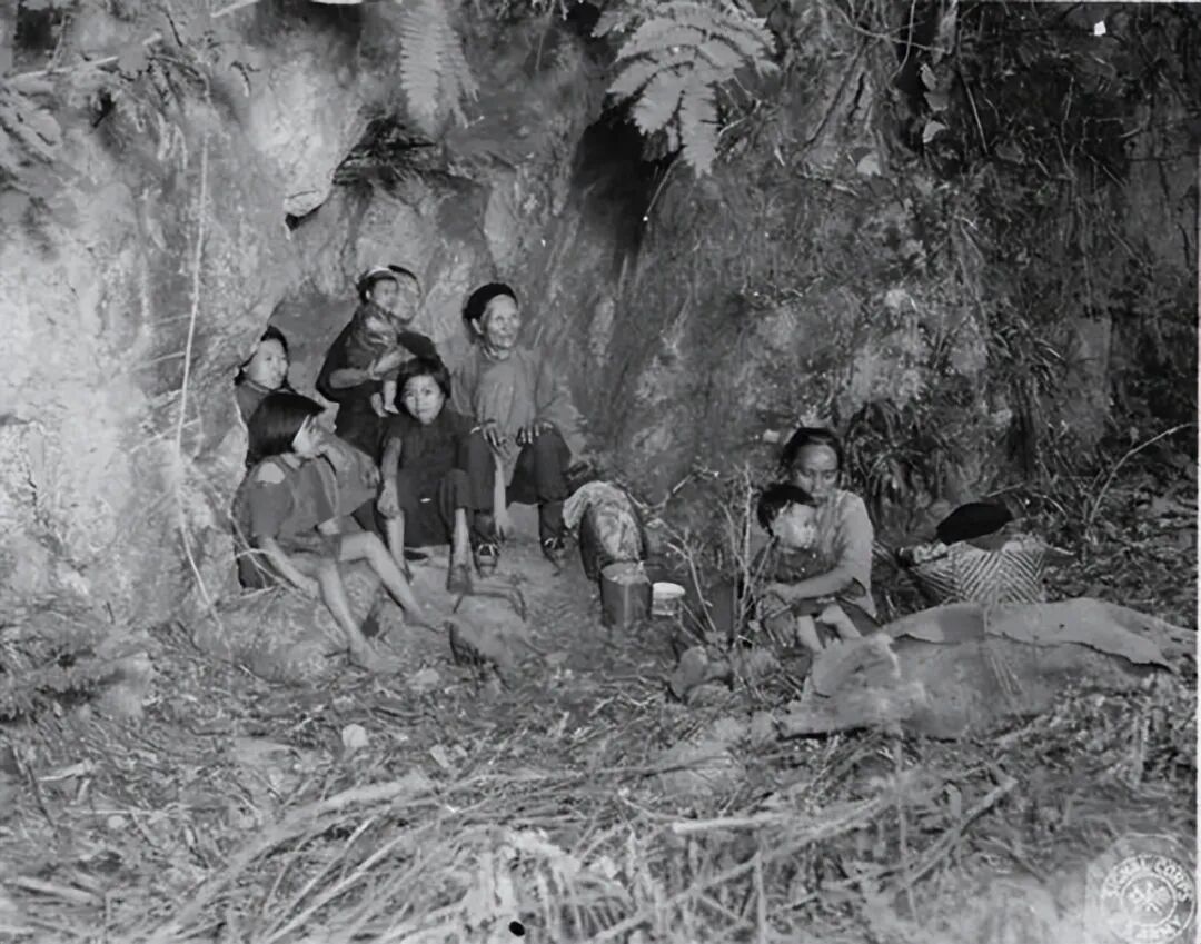 这些坐在中国仁新(音Yen Sehin)郊外的小山洞里的人是躲避轰炸的市民,该城市于 1944年5月13日被日军飞机轰炸。许多人因轰炸而无家可归,燃烧弹从天而降,导致市区多数房屋起火燃烧。