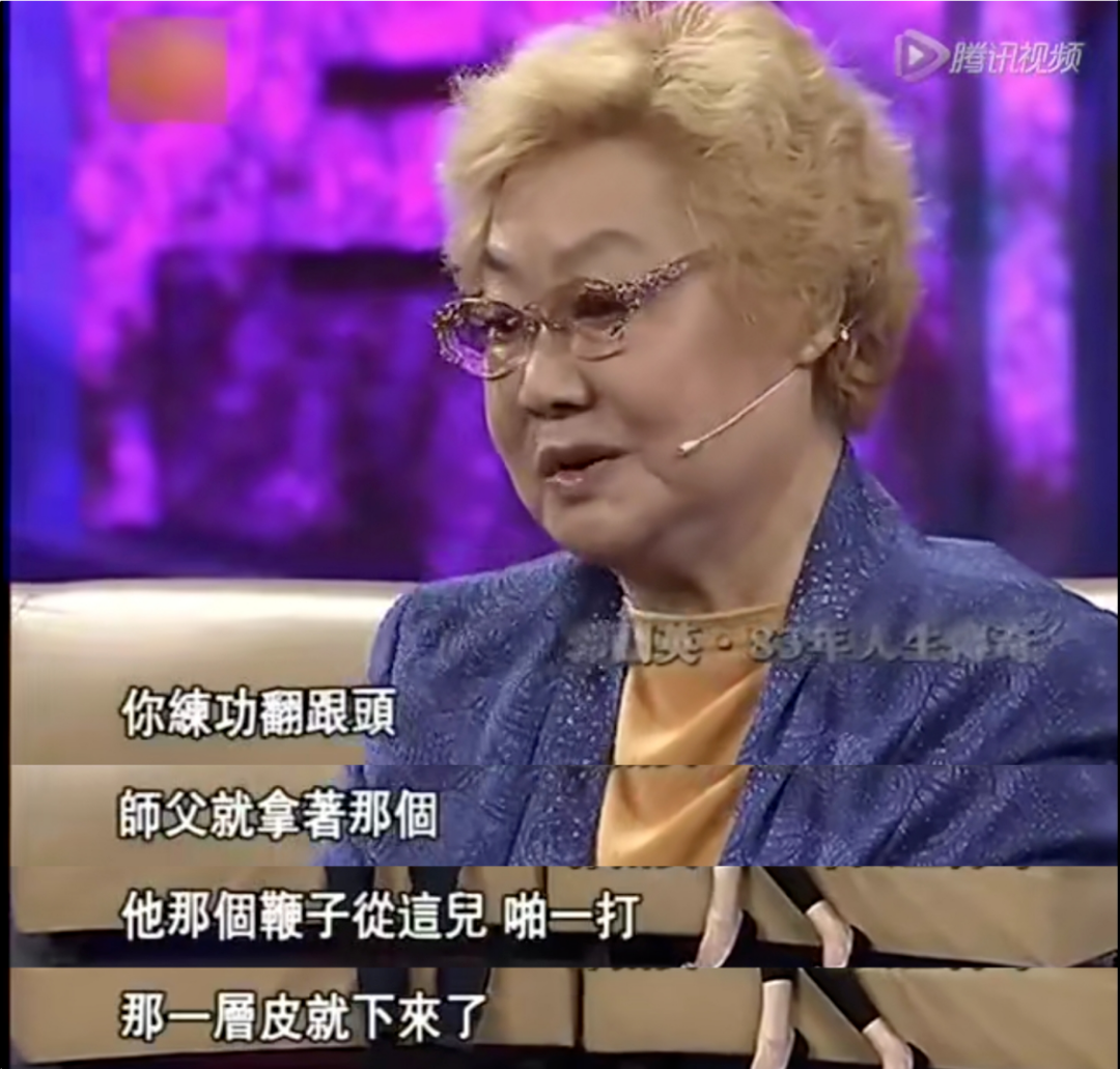 练功翻跟头,师傅拿着鞭子,动作有一点点不到位,就是一顿皮开肉绽。