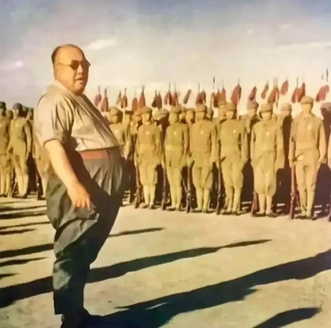 上世纪40年代,宁夏。马鸿逵检阅自己部队“马家军”时的老照片。