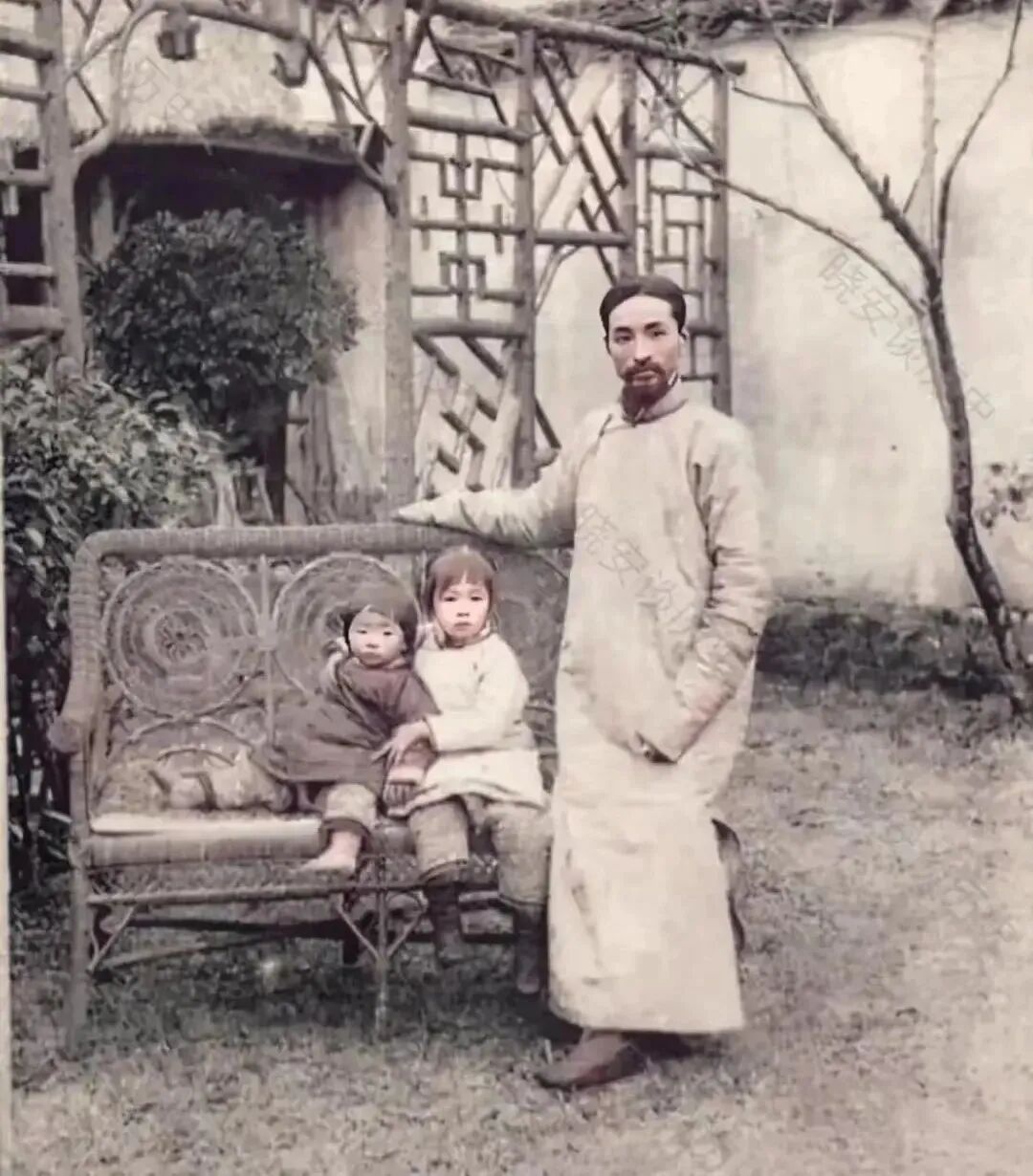 林徽因1904年出生于浙江杭州,图为1910年的林徽因搂着2岁的妹妹林麟趾坐在藤椅上,与父亲林长民在老家的庭院里留影。妹妹后来不幸夭折,林徽因还有一个很有名的叔叔,就是“黄花岗七十二烈士”之一的林觉民。