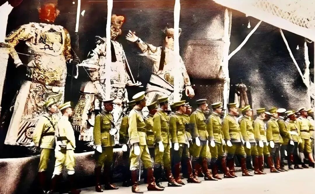 图为葬礼上扎起的巨大纸人,两排奉系军官列队站在灵棚之前。