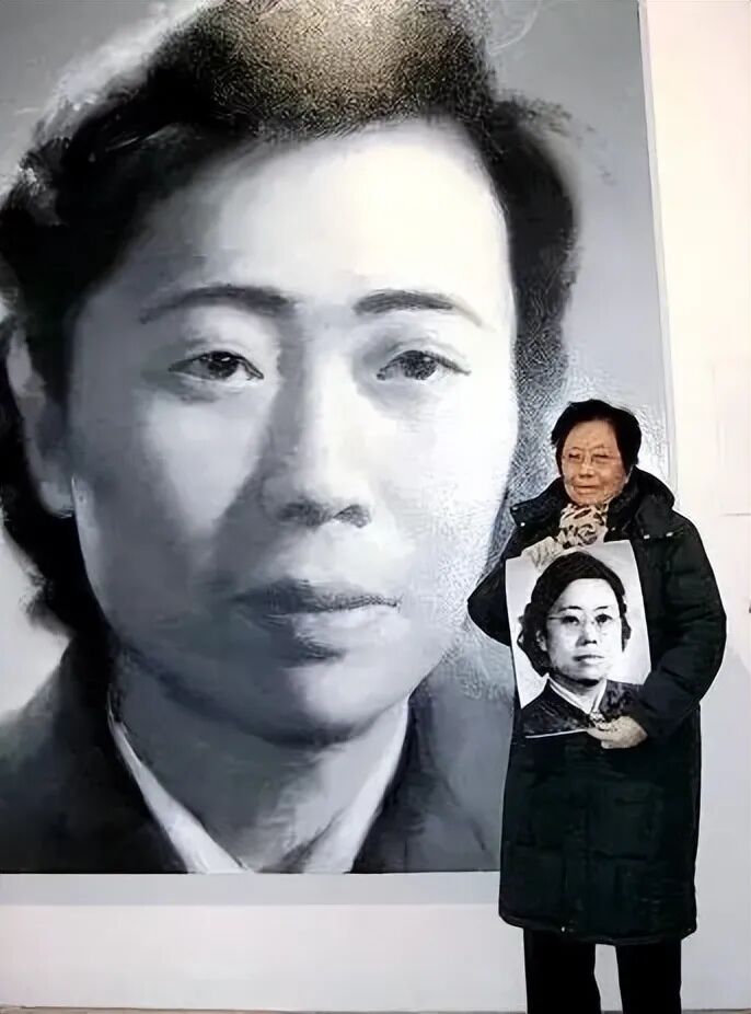 聂元梓在《历史中国众生相1966——1976》展览开幕当天站在自己50年前的形象前留影。她手里拿着一张自己满意的文革期间的大照片,照片上的她戴着眼镜。