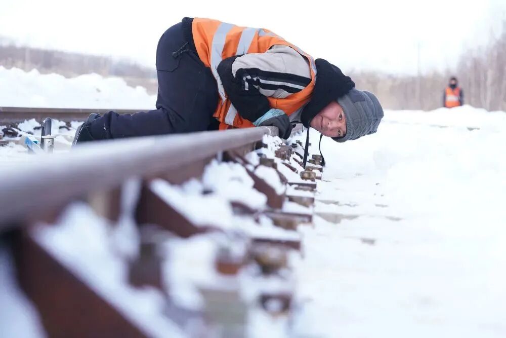 2024年1月23日,在抚远站附近,中国铁路哈尔滨局集团有限公司佳木斯工务段前进镇线路车间抚远工区班组成员进行冬季线路冻害检修作业。新华社记者 王松 摄