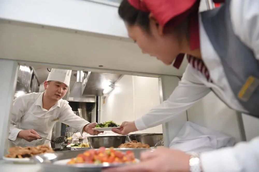 2019年1月21日,在福建福州开往四川广安的K4186次临客列车上,厨师林炜(左)在盛菜。新华社记者 宋为伟 摄