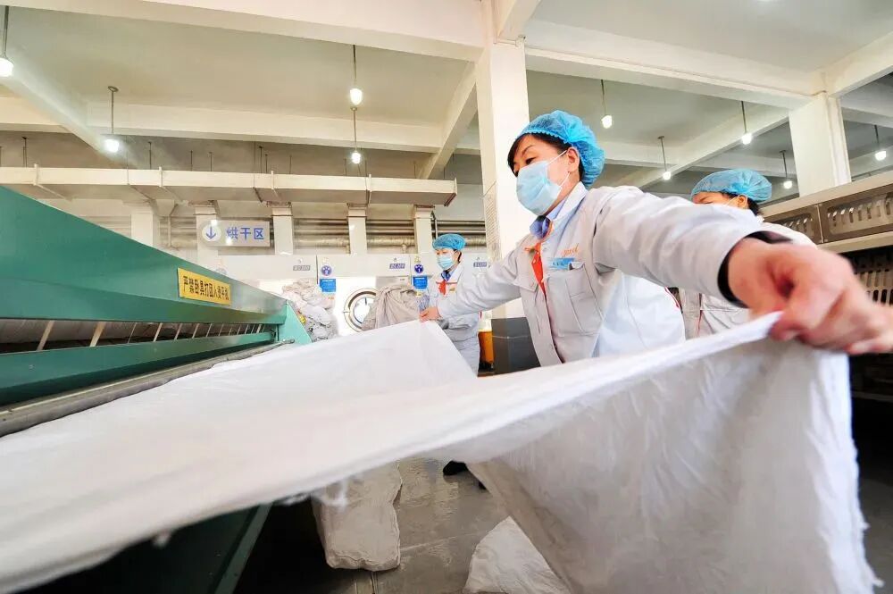 2014年1月20日,在兰州铁路局银川客运段洗涤装卸车间内,洗涤女工在加班加点清洗列车上的卧具。新华社记者 彭昭之 摄