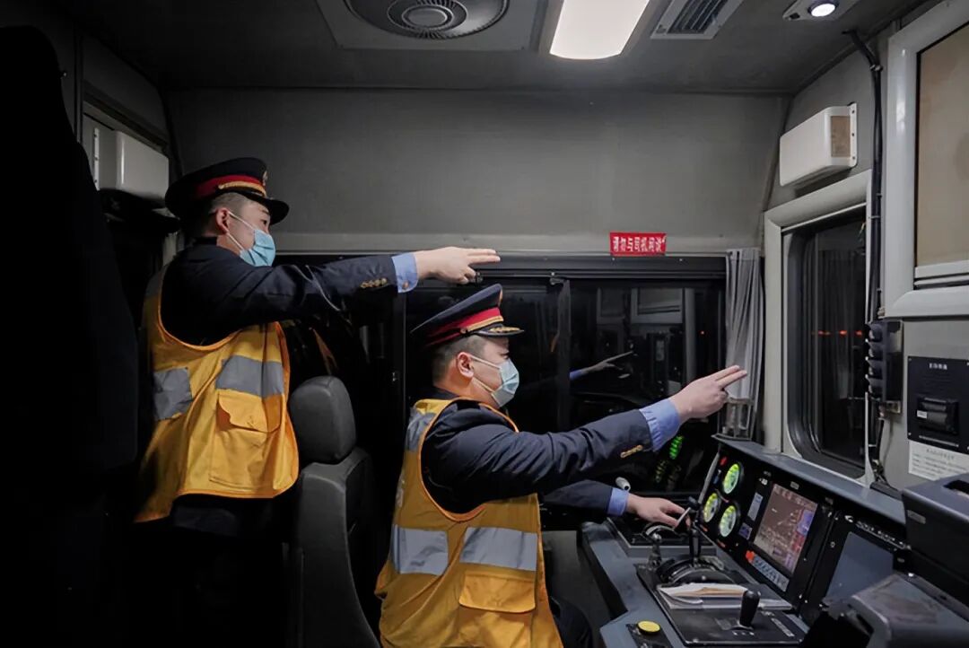 2022年1月19日,成都国际铁路港调乘司机(右)和副司机同侧手指确认首架信号机,准备发车。新华社记者 薛晨 摄