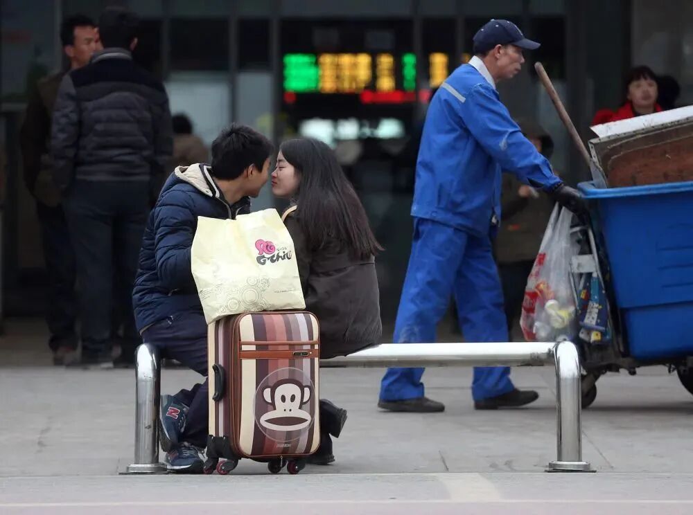 2015年2月7日,在长沙火车站,两名年轻人坐在隔离栏上等候进站乘车。新华社记者 李尕 摄