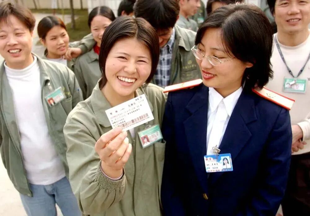 2003年1月22日,在广东省东莞市三和塑胶制品有限公司打工的江西省上饶市女青年张云英(前左)开心地拿到了南昌铁路局春运服务小组送来的节后返程票。新华社记者 陈春园 摄