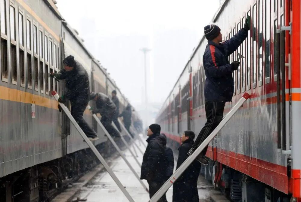 2012年1月7日,北京客运段保洁车间人员在擦拭新增春运临客列车的玻璃。新华社记者 唐召明 摄