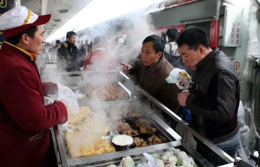 2008年1月28日,在郑州火车站,旅客在站台购买热腾腾的饭菜。新华社记者 陶明 摄
