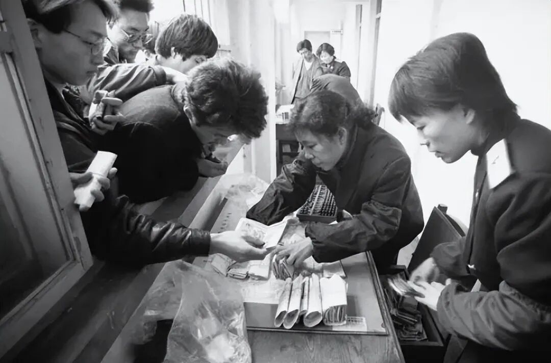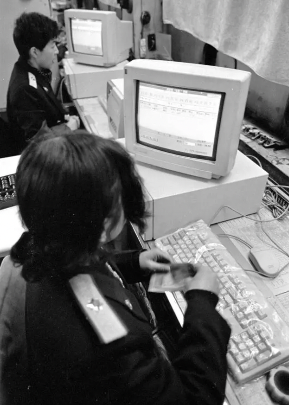 1997年,计算机打印的红色软纸票正式投入使用,从“做手工”到“敲键盘”,售票速度从几分钟压缩到几十秒。图为1997年1月,乌鲁木齐火车站告别了30多年来人工售票的历史,开始实行微机售票。新华社记者 艾尼瓦尔 摄
