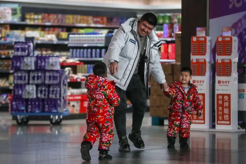 2024年1月26日,在内蒙古工作的李振南带着两个儿子在沈阳站中转,准备回黑龙江佳木斯市过年。新华社记者 潘昱龙 摄