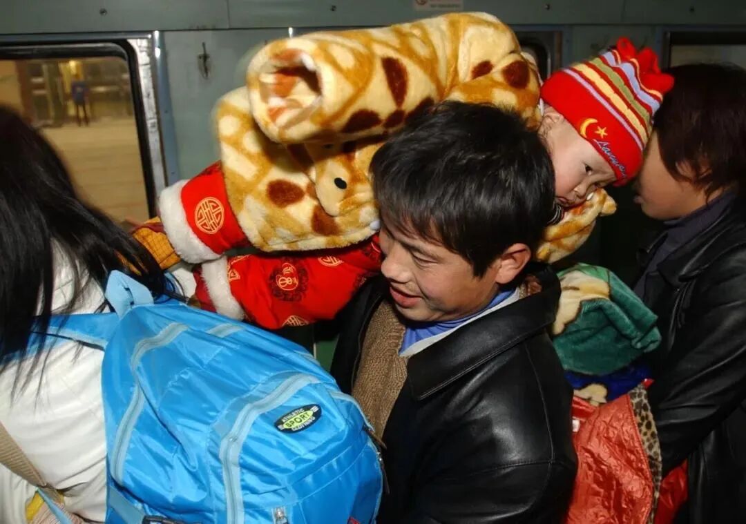 2005年1月14日,一名农民工扛着娃娃走进从北京西站开出的“民工专列”。新华社记者 李文 摄