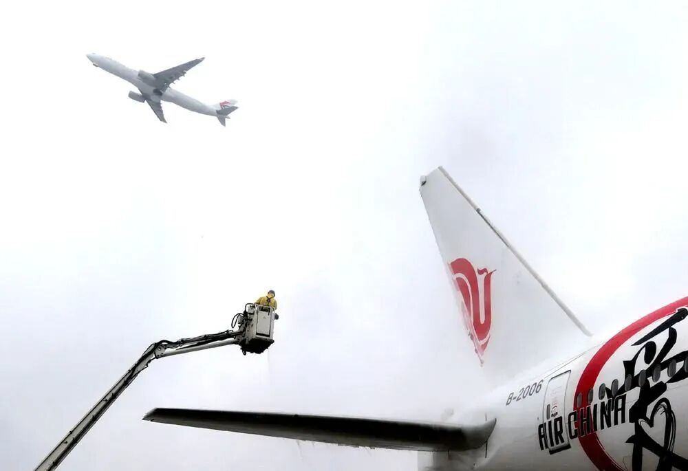 2018年1月25日,上海虹桥机场的地勤人员为大型客机除冰雪,减少航空器滞留时间。新华社记者 陈飞 摄