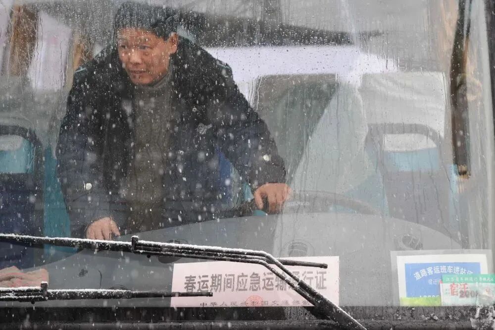 2008年2月1日,宿迁市的一名司机驾车来到南京长途汽车总站支援春运。当日,由江苏省交通厅从春运压力较小的苏北各市客运公司调集的110多辆客车冒雪来到南京长途汽车总站,帮助疏散这里的滞留旅客,送他们早日回家过春节。新华社记者 孙参 摄