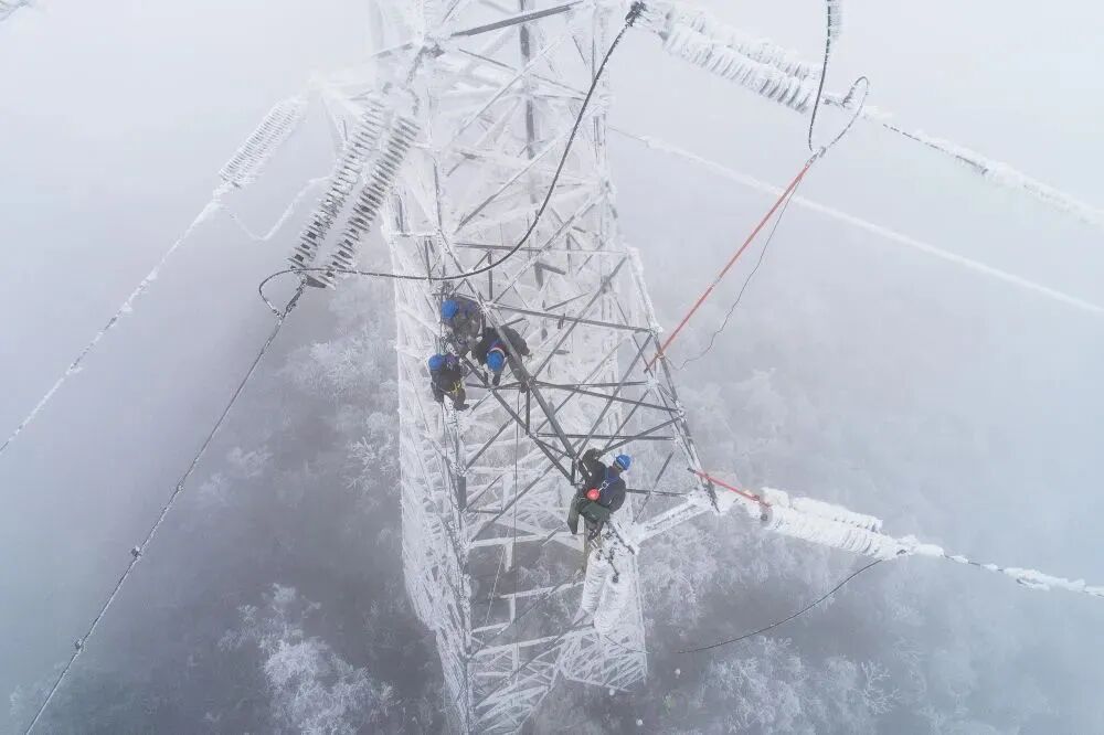 2019年2月12日,在湖北武汉清凉寨山区,电力工人在结满厚冰的输电塔上抢修作业,保障京广高铁相关区段供电。新华社记者 肖艺九 摄