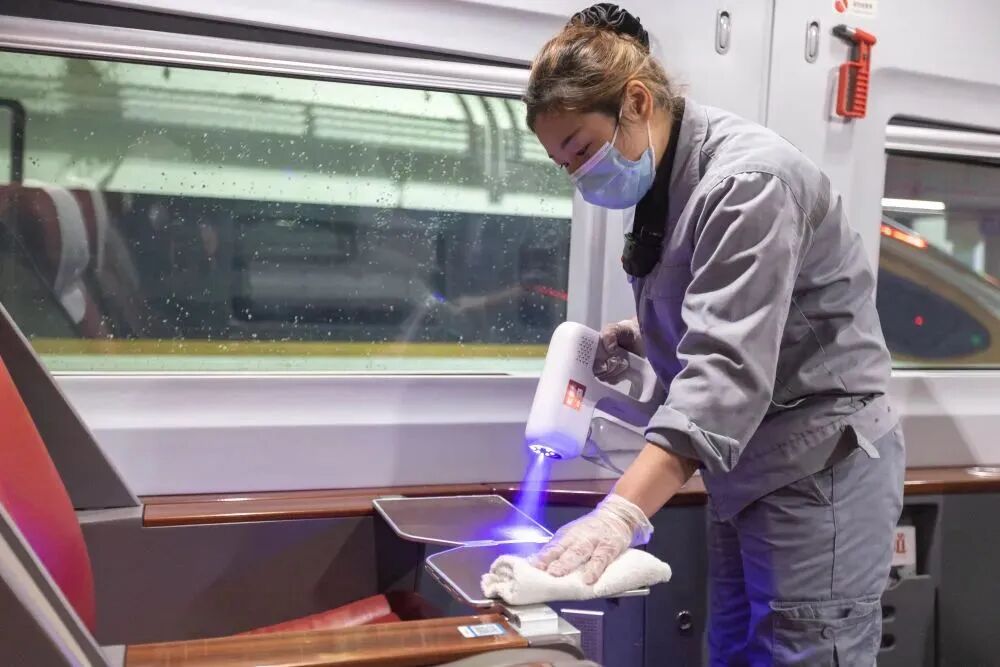 2023年1月16日,工作人员对入库终到上海动车段虹桥动车运用所的动车组列车开展消毒清洁作业。新华社记者 王翔 摄