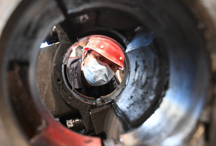 2021年2月16日,一名“落轮工”在检查电机基孔的平整度。在中国铁路南宁局集团有限公司柳州机务段,有一群专门给火车头换轮子的工人,业内人士称他们为“落轮工”。每年春节他们都牺牲休息时间,坚守岗位,全力保障春运安全。新华社记者 张爱林 摄