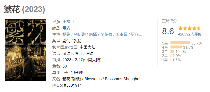 《繁花》是一部以上海为背景的电视剧,讲述了在改革开放时期,一群不同的人在事业和感情上的纠葛。