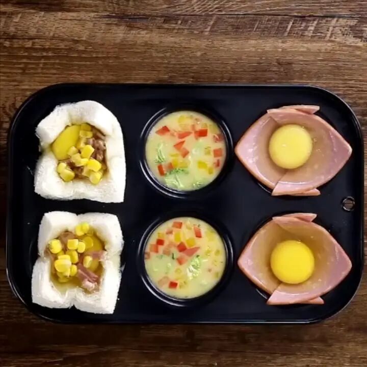 日常的早餐也有它的身影,不需复杂繁琐的做法,只需一块吐司、一片火腿、一只鸡蛋、一把面粉,再加一些新鲜蔬菜,一炉就能做出3款。