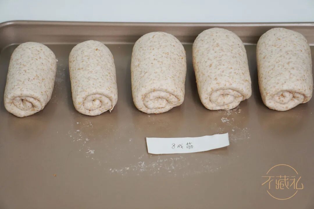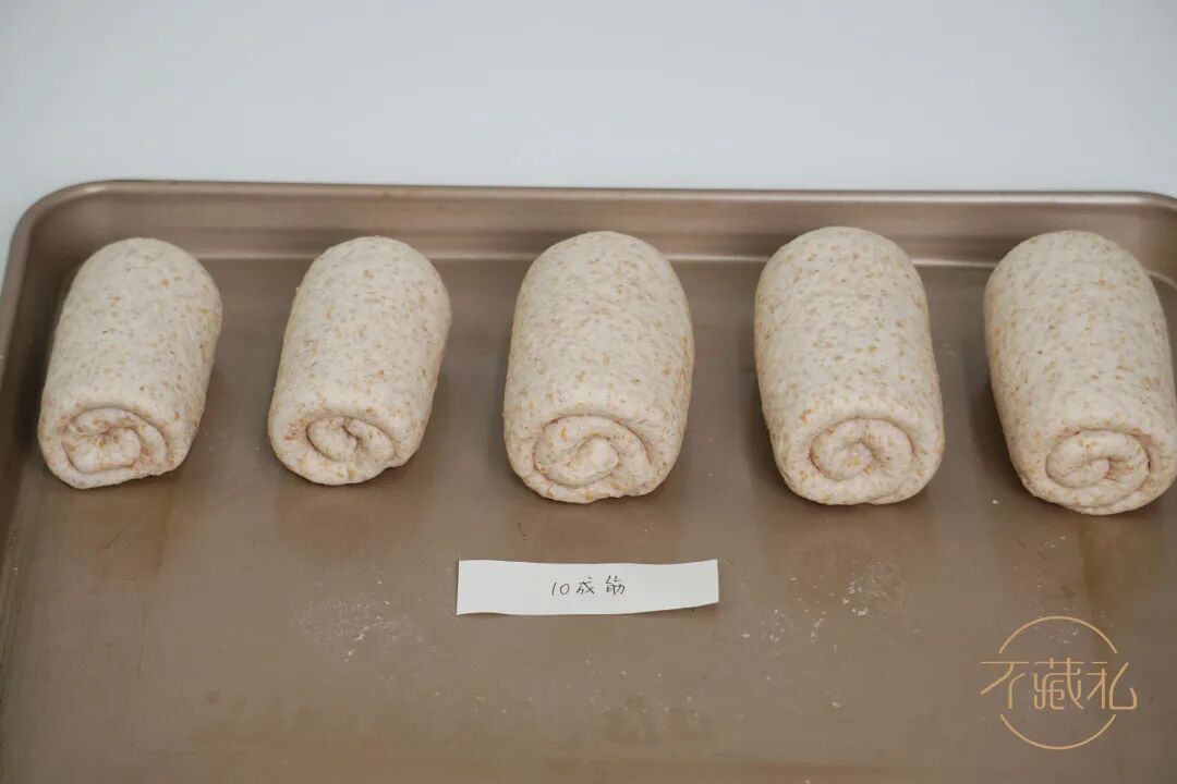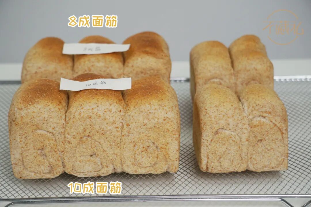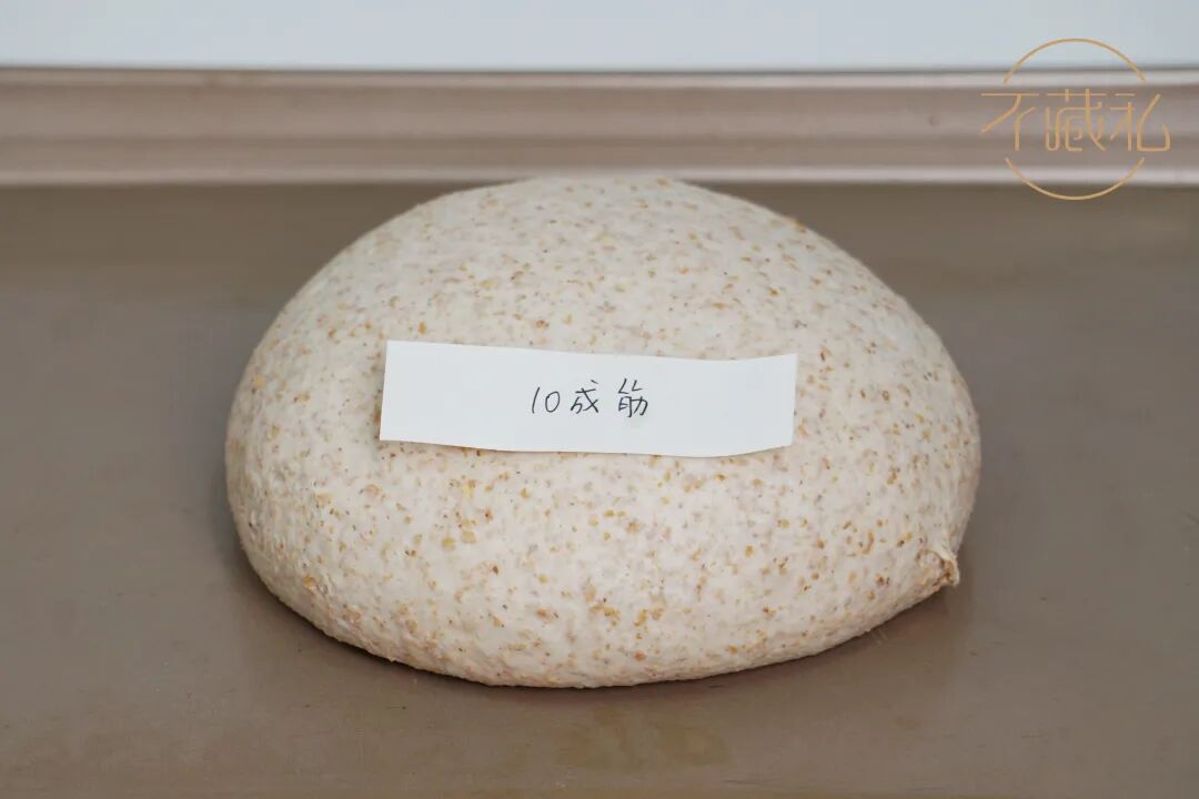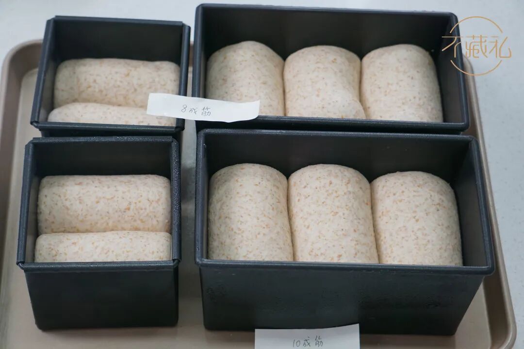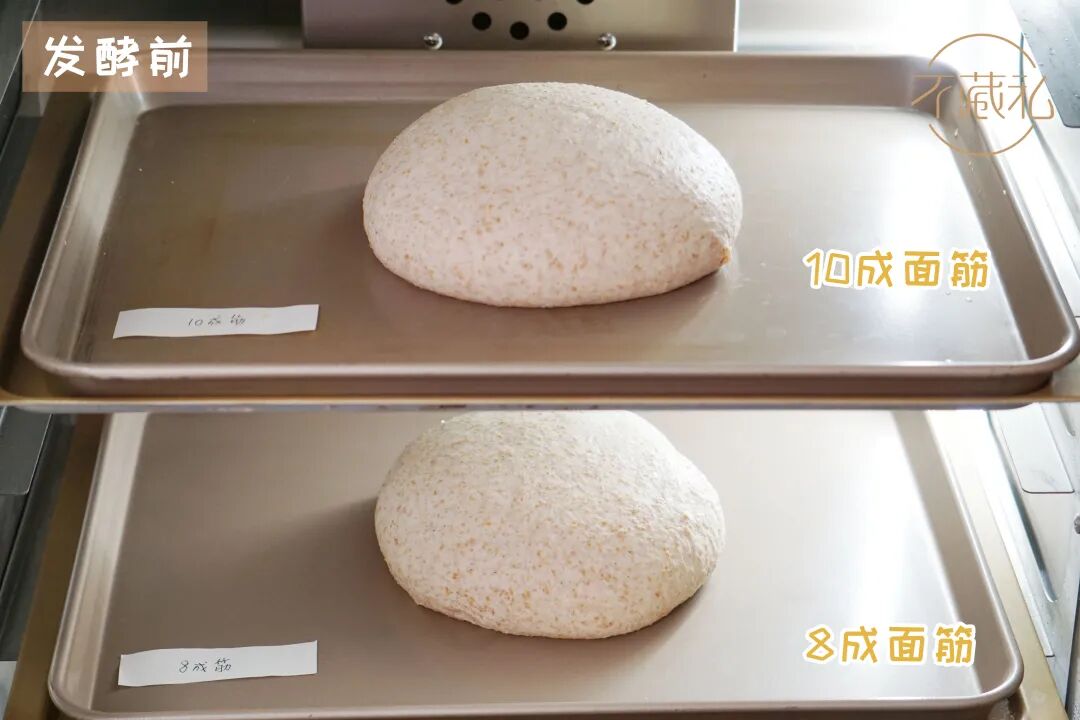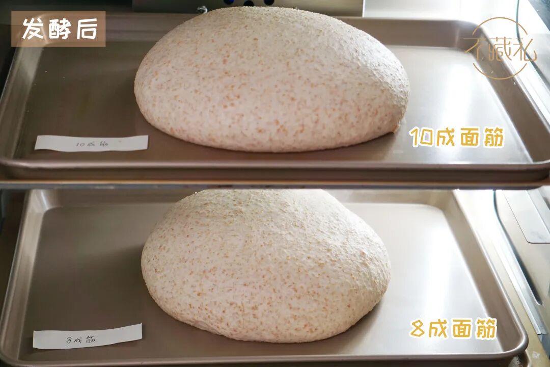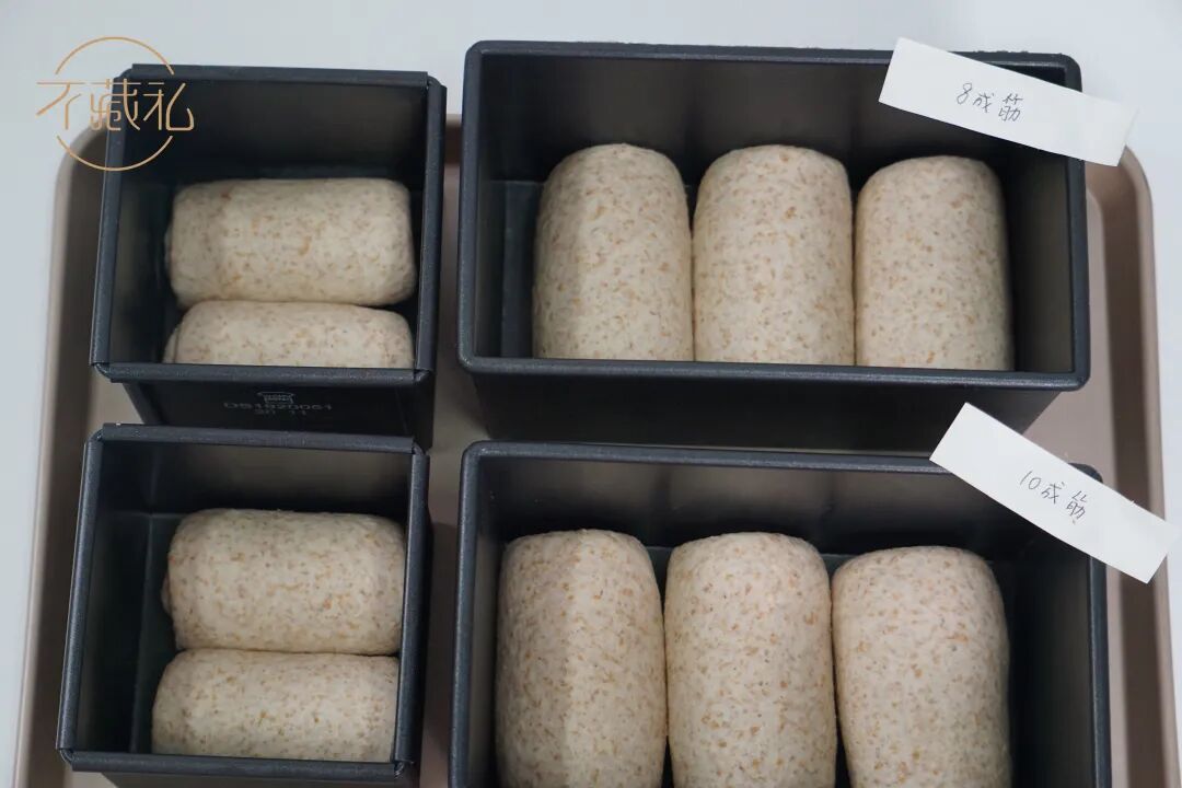 发酵完成后,8成筋全麦面团,发至模具8分满,已经是极限,不可再发,10成筋全麦面团发至模具8.5分满,比8成筋的面团明显会发的高一些。
