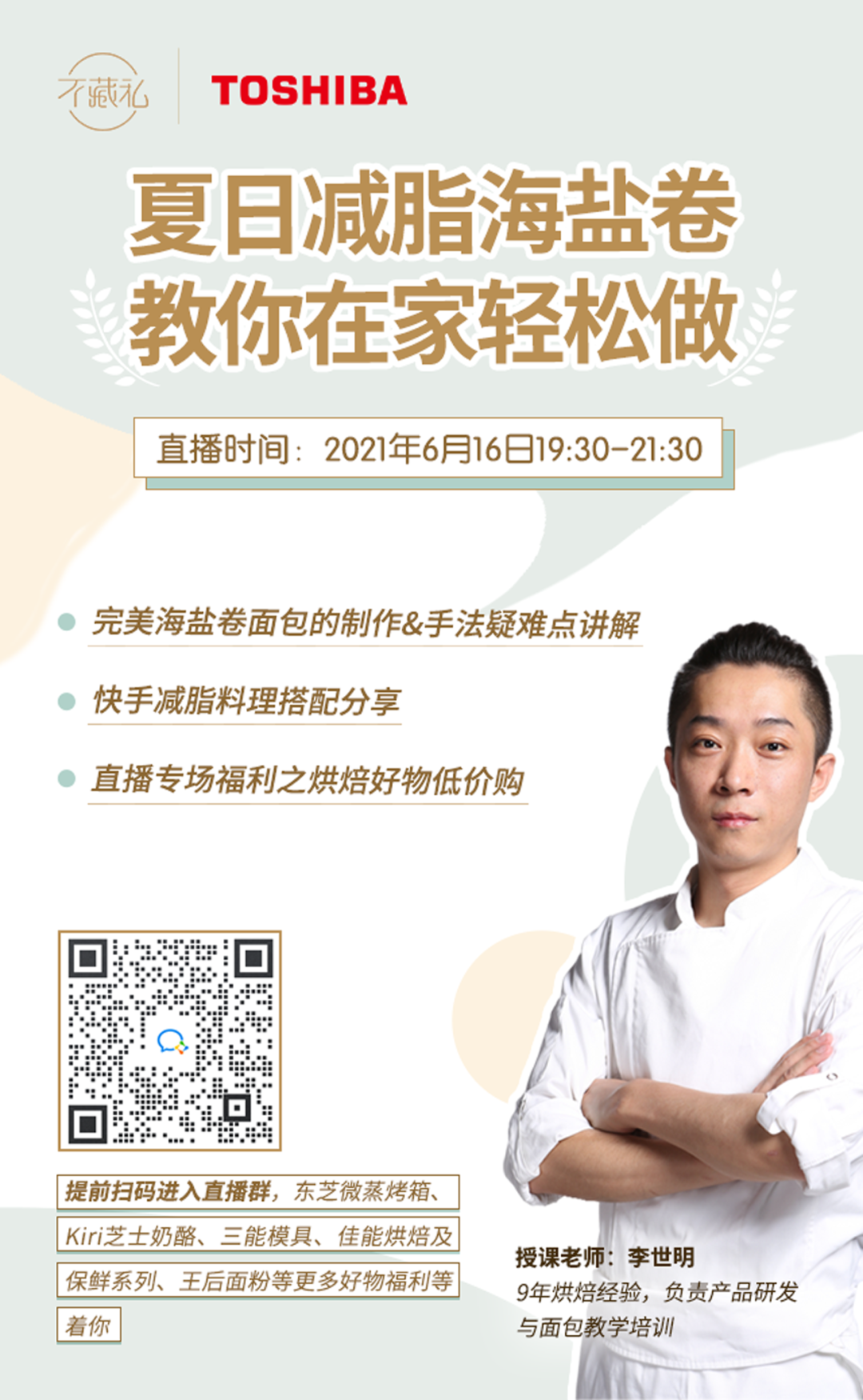 *ps:扫码提前进入直播群,东芝微蒸烤箱、Kiri芝士奶酪、三能模具、佳能烘焙及保鲜系列、王后面粉等更多好物福利等着你。