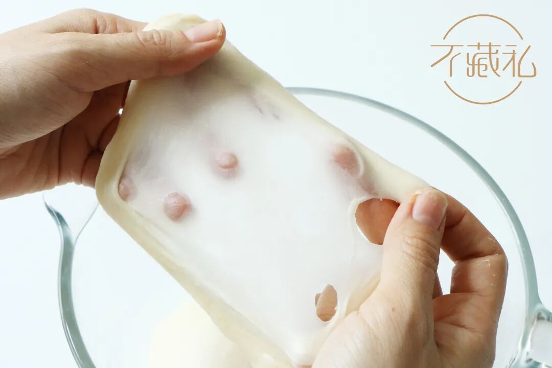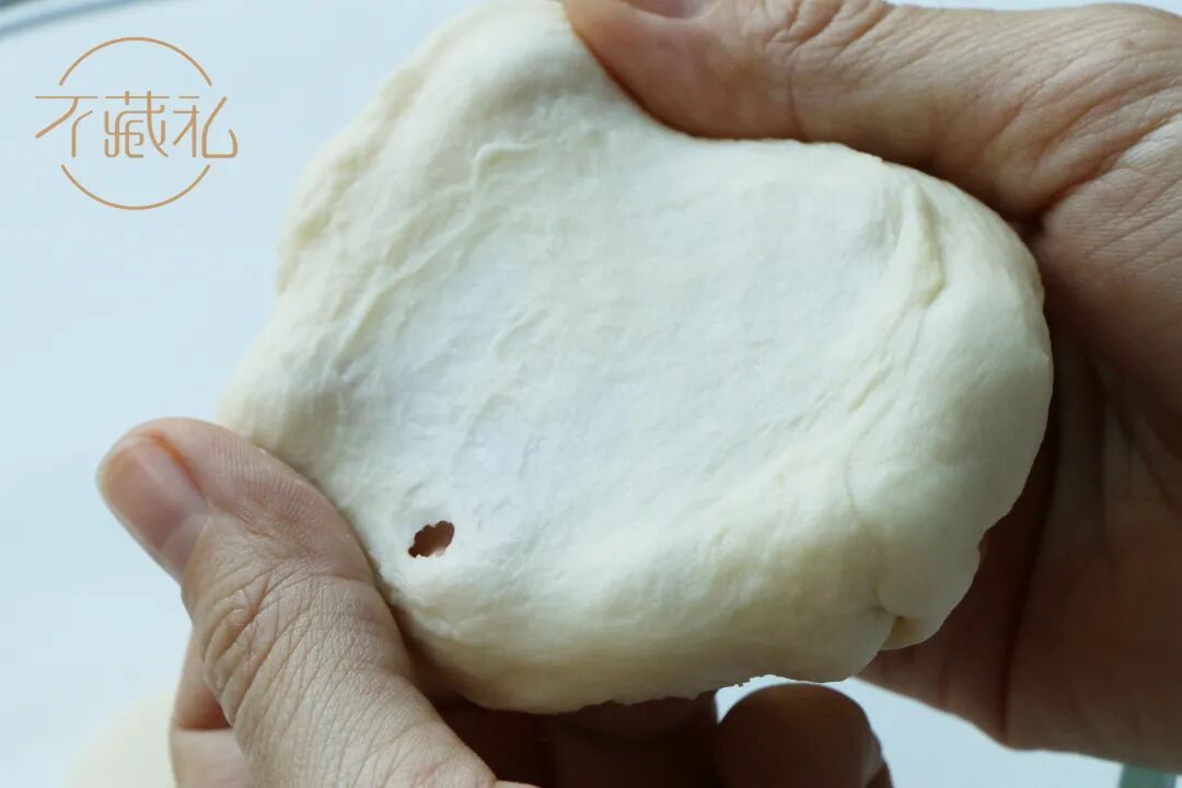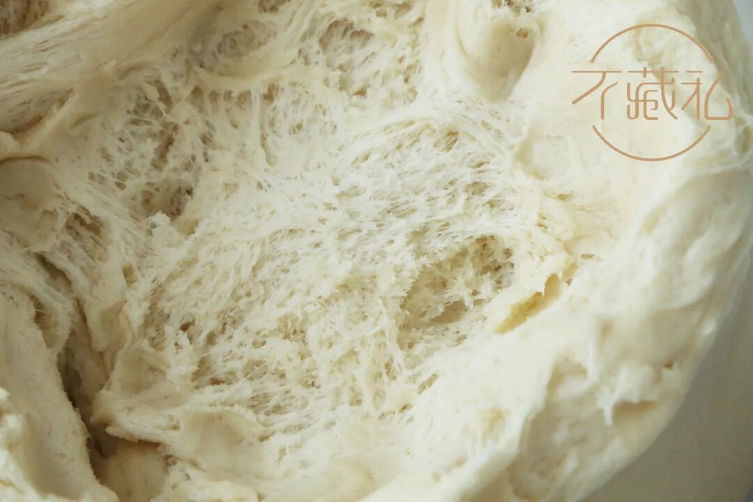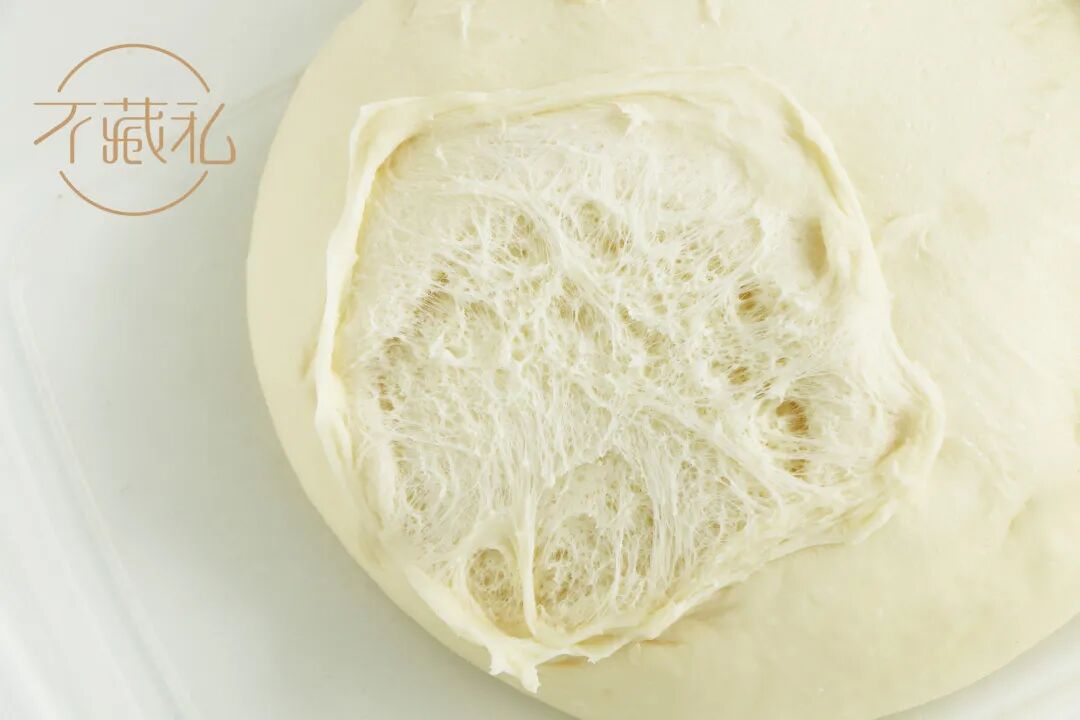 发酵好的面团,会变成2倍大左右,扯开表面一样有细密的蜂窝状组织,但组织的状态会比100%中种更加柔软细腻。
