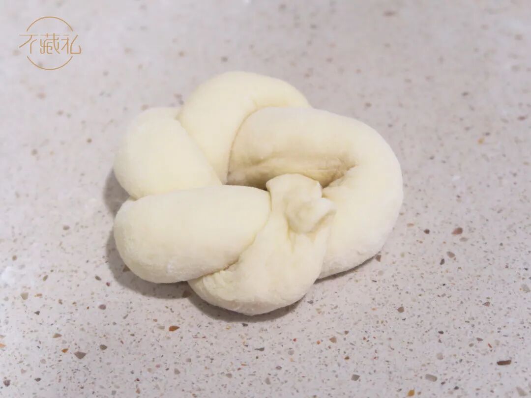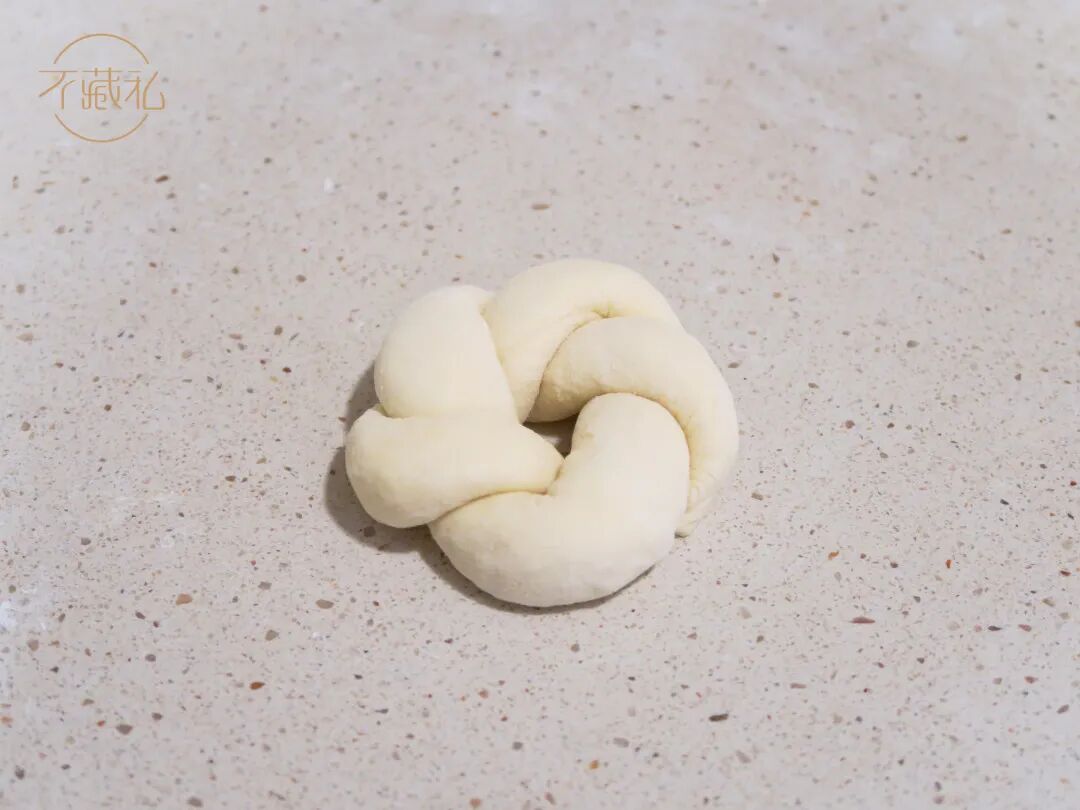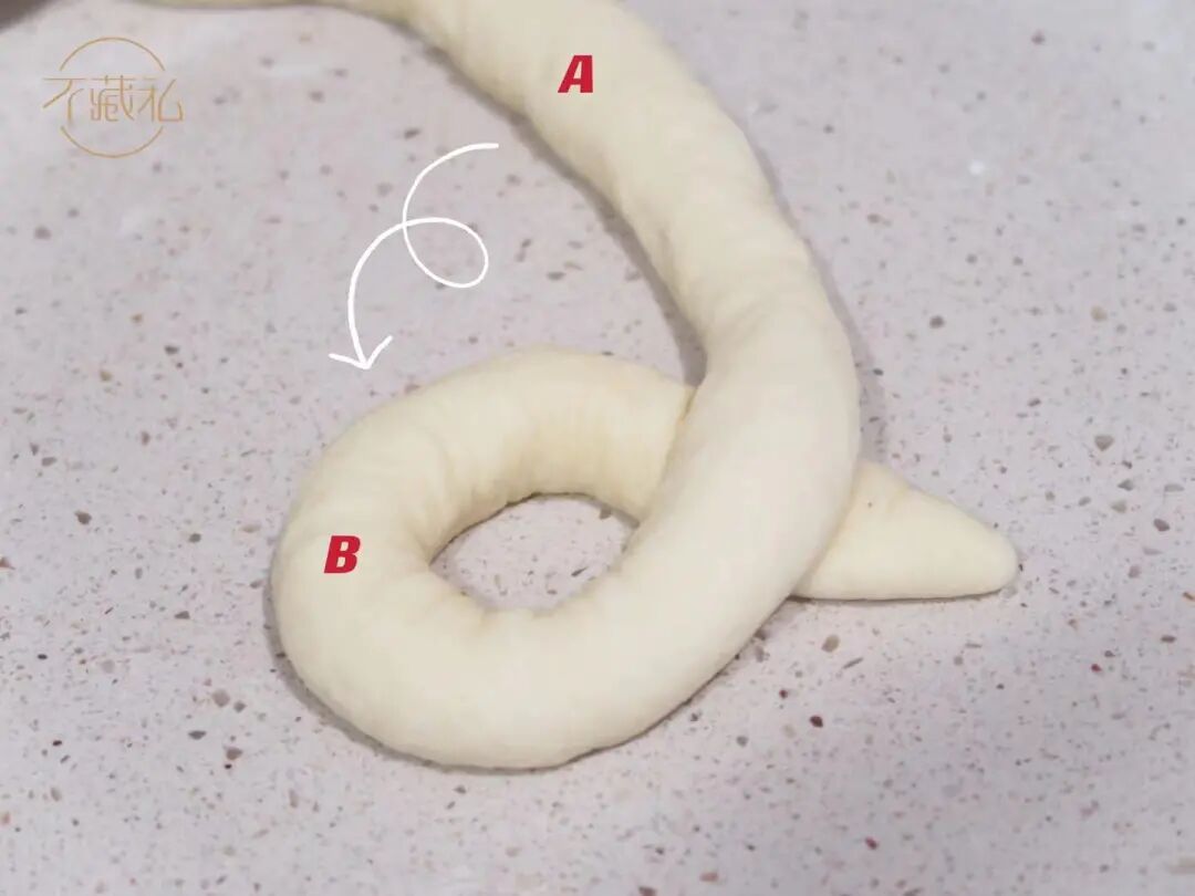 如图将面团的一头绕一圈,取长的那部分在环内绕3-4圈。