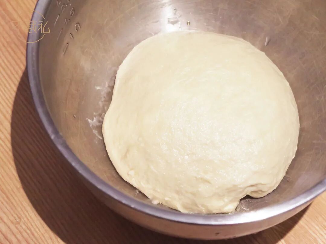 面团温度应当在23-26℃,取出面团,团圆,放入容器内,室温(25-28℃)一次发酵。