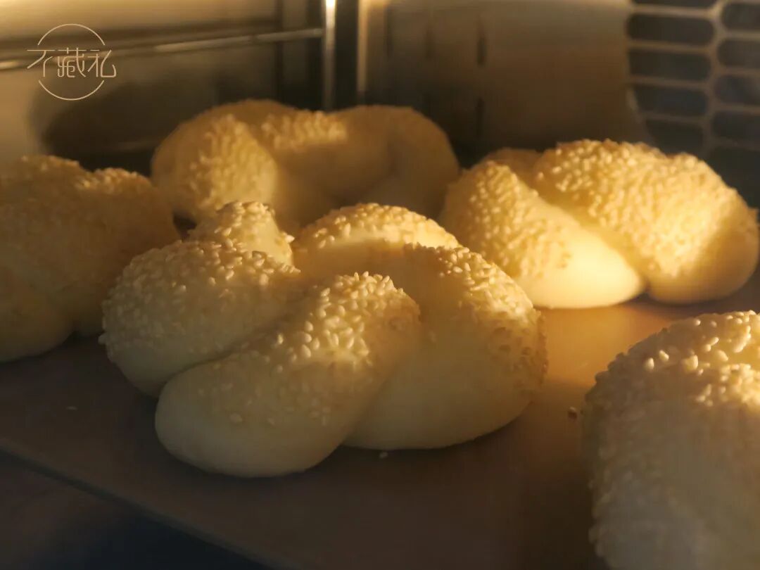 发酵结束后,轻按面团,会留下痕迹,代表发酵完成。此时将面团放入预热好的烤箱中烘烤,185℃烘烤14分钟左右,外表上色满意即可取出。