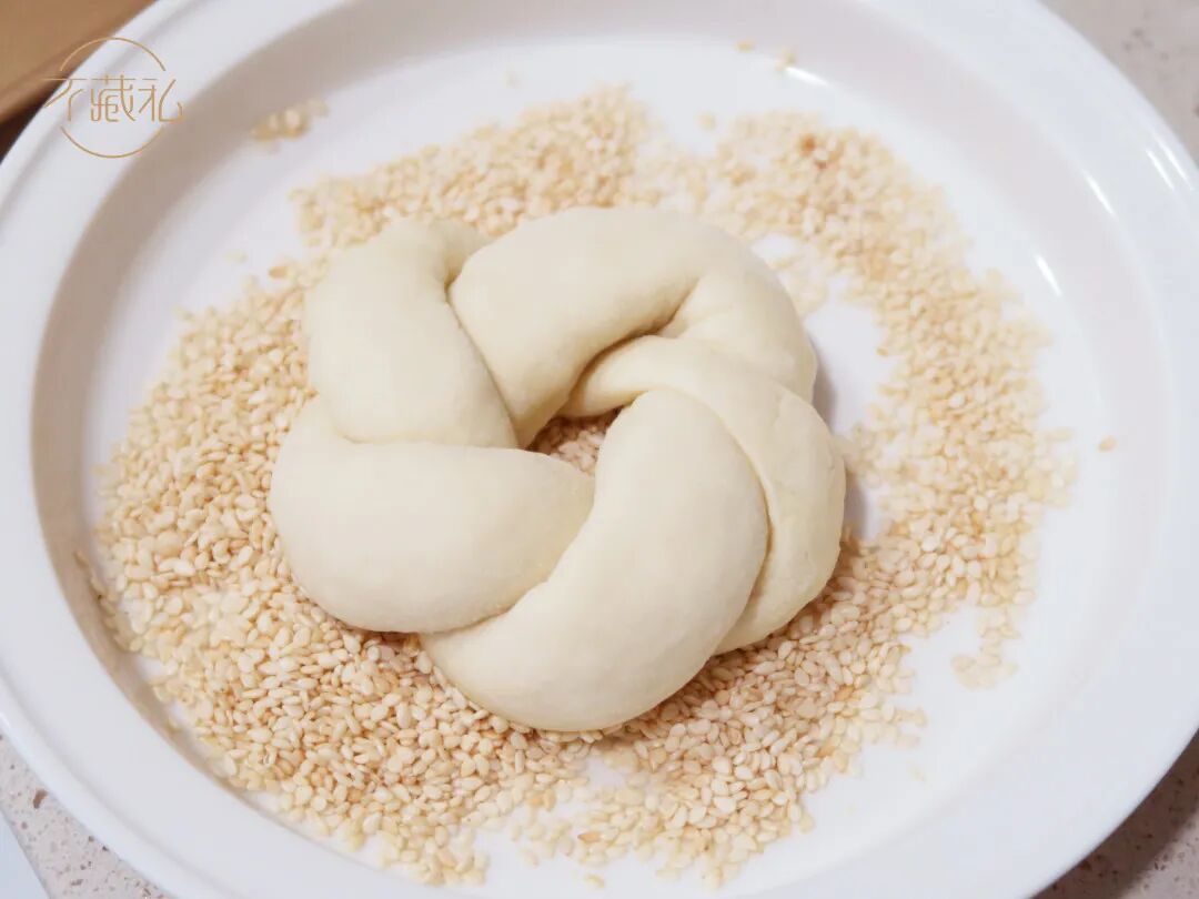 所有面团整形好之后,正面刷上蜂蜜水,然后放到装满白芝麻的盘中,沾上满满的白芝麻。