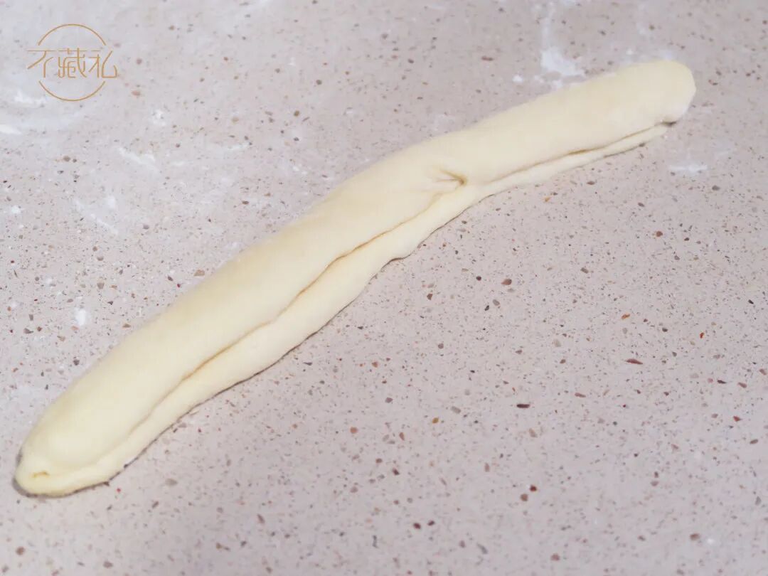 松弛结束后,取出面团,拍平排气之后折叠两次(类似法棍的手法),然后搓成50cm左右的长条状。