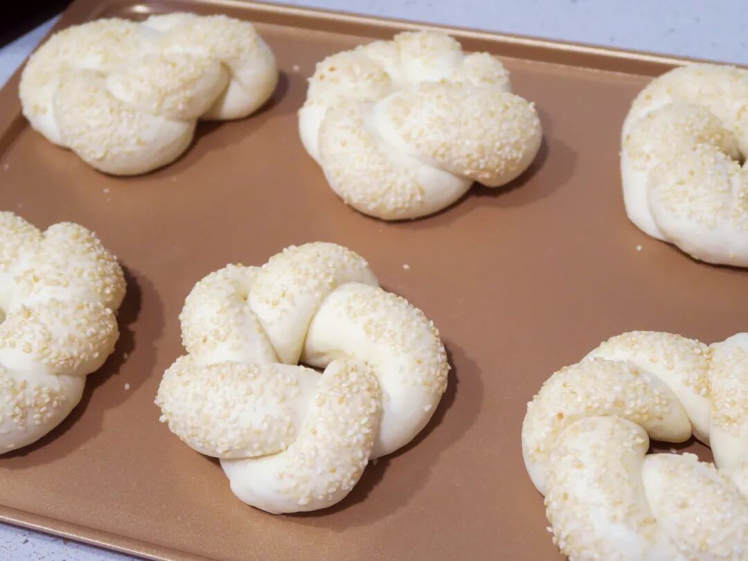 放到烤盘上,面团之间保持足够的间距,放到27℃左右的潮湿环境进行最后醒发。
