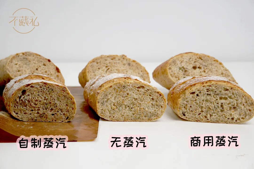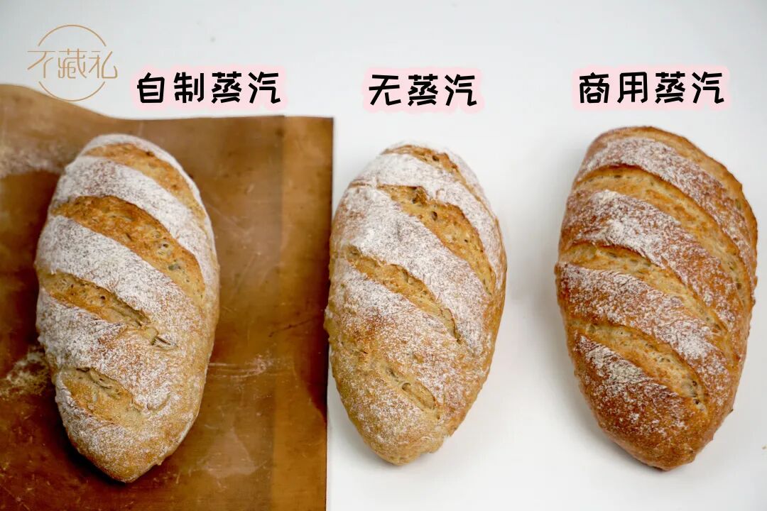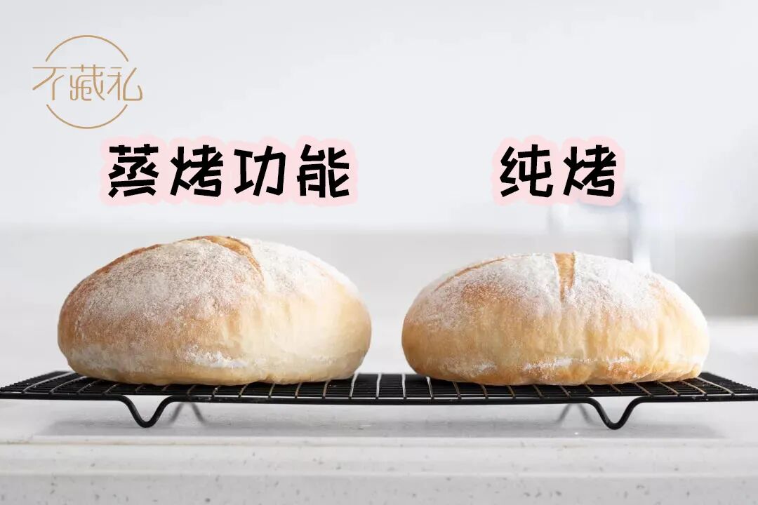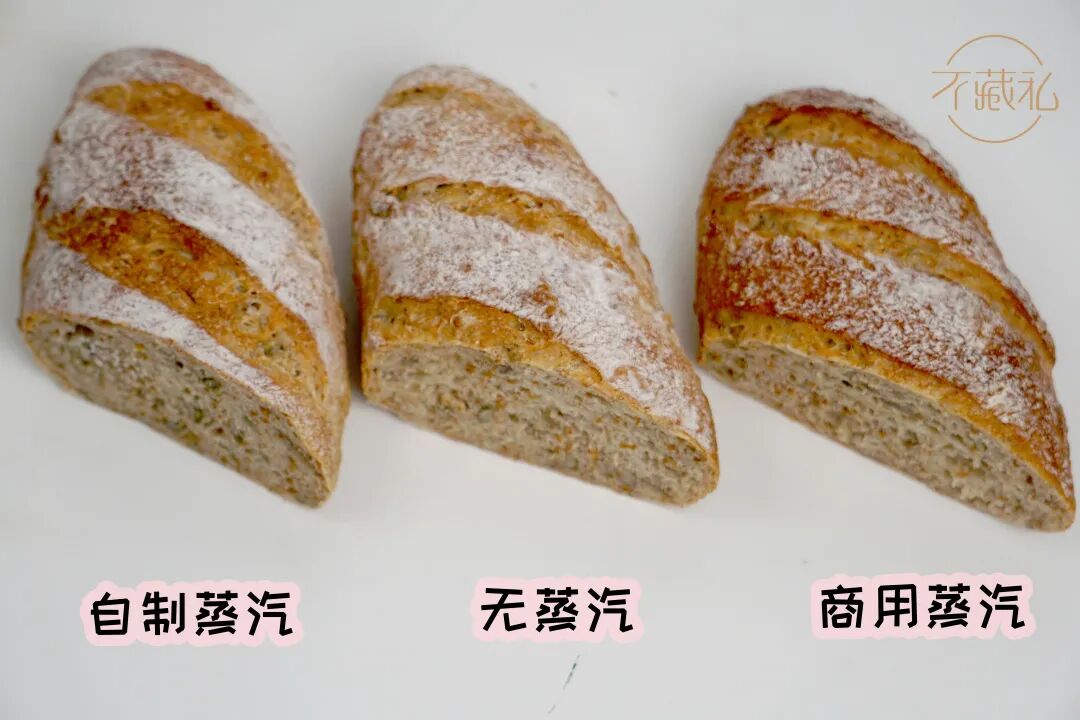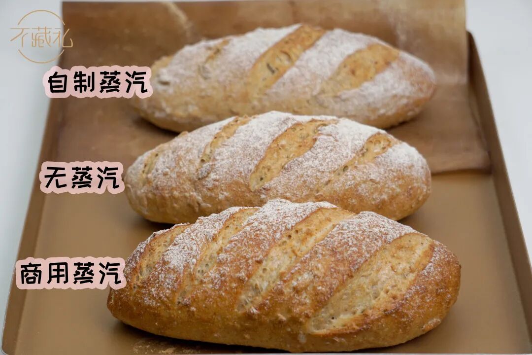 以前不藏私好奇实验室也用过蒸烤箱的蒸汽烘烤功能做测试,确实带蒸汽的面包会比纯烤的面包要来得挺拔。