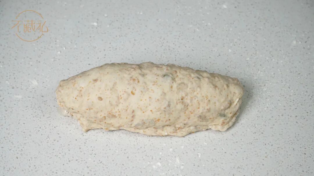 ①把面团分切为345g每份,松弛20分钟。取一份面团,光滑面朝上,稍微拍扁后翻面。