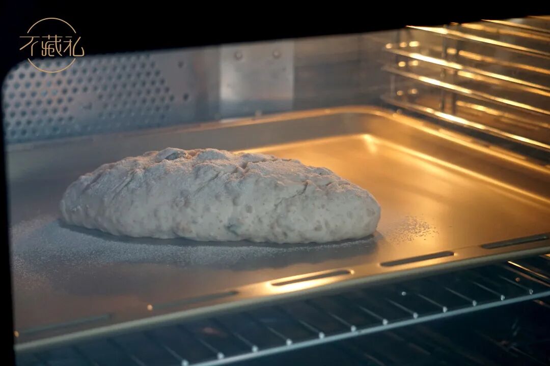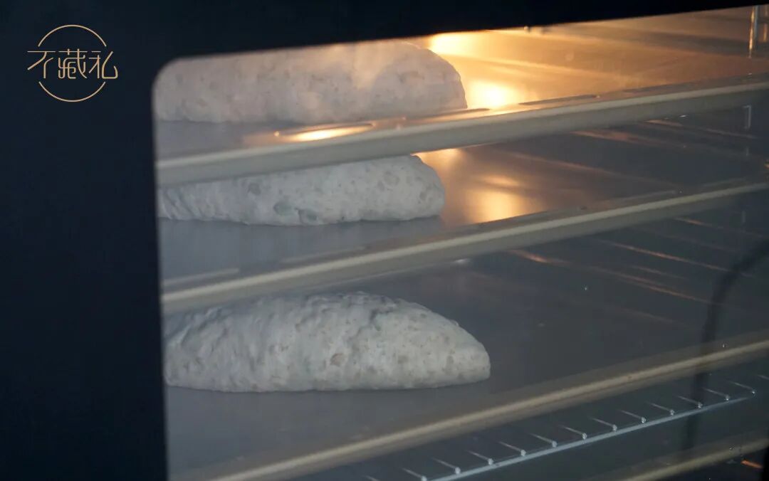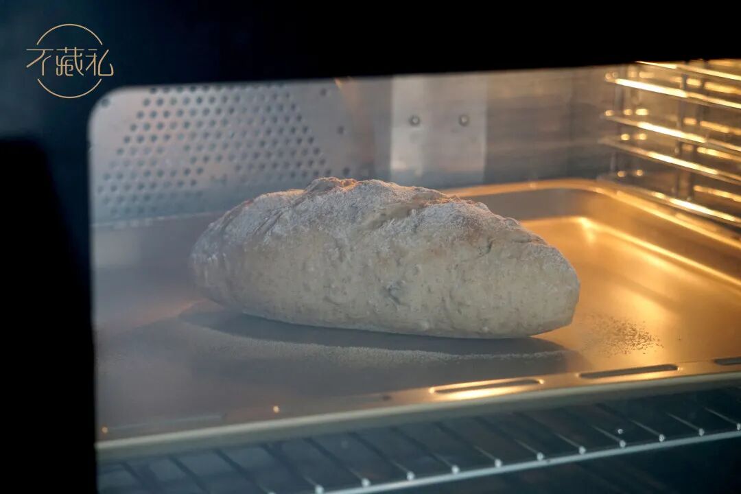 ①家用烤箱自制蒸汽(烘焙石+石板):烤箱放入石板和烘焙石,以上火230℃,下火200℃预热40分钟,把发酵好的面团用油布放在烤箱石板上,快速向石子喷热水、迅速关烤箱门。烘烤至第4分钟时打开烤箱门喷一次热水,第15分钟时上火降至200℃,继续烘烤7分钟,总烘烤时长22分钟。