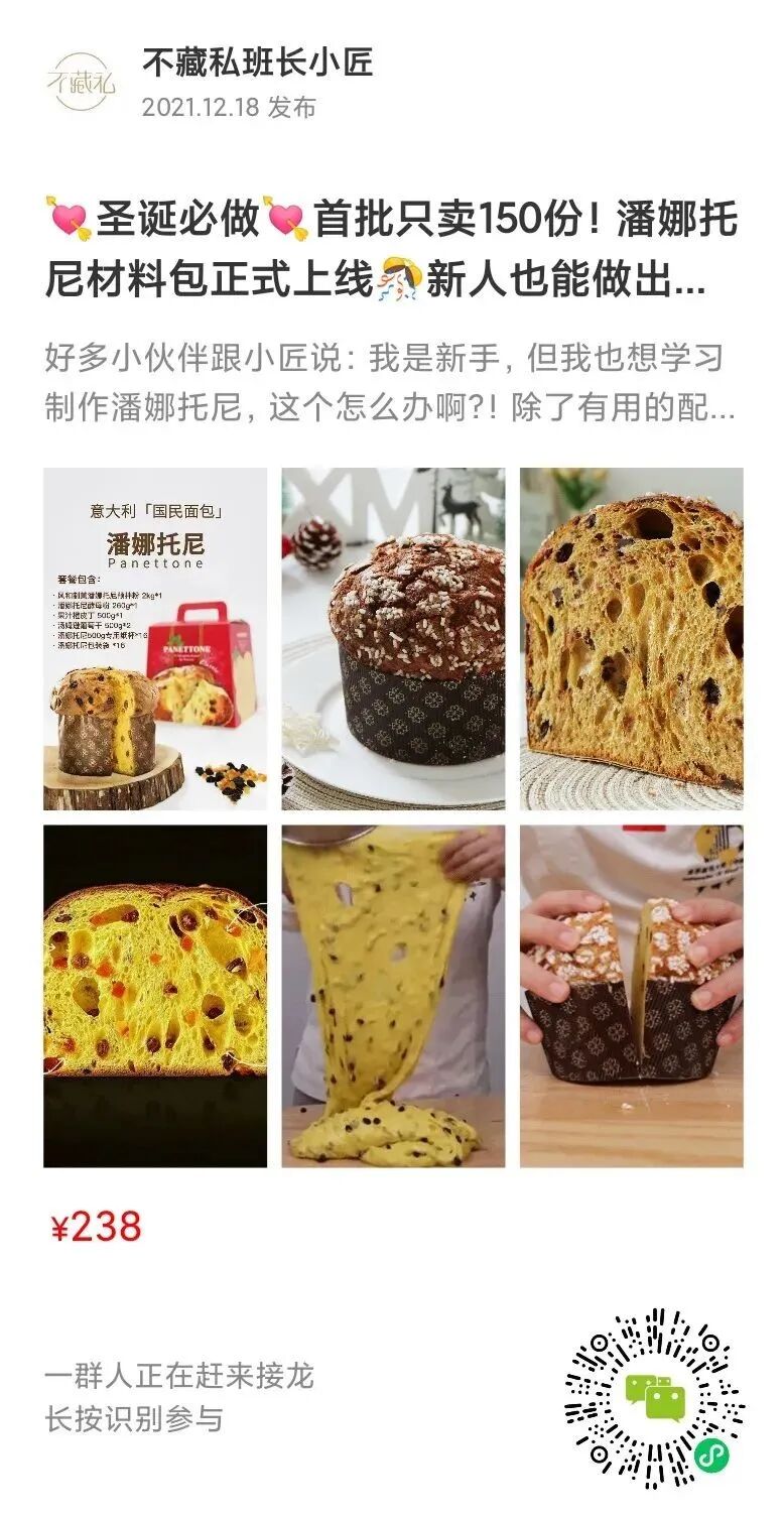 在忙碌的圣诞季,随便一家面包店售卖的标准规格的潘娜托尼都卖到了100+的价格,果然,好味值得。但是对于需要批量生产的小店主/私房工作室来说,动辄上月的时间、精力只做这一款蛋糕,带来的损耗是巨大的。如果有像麻薯、大米面包这样有预拌粉就好了!毕竟对于小作坊来说,节约成本、将受益最大化才是最重要的。
