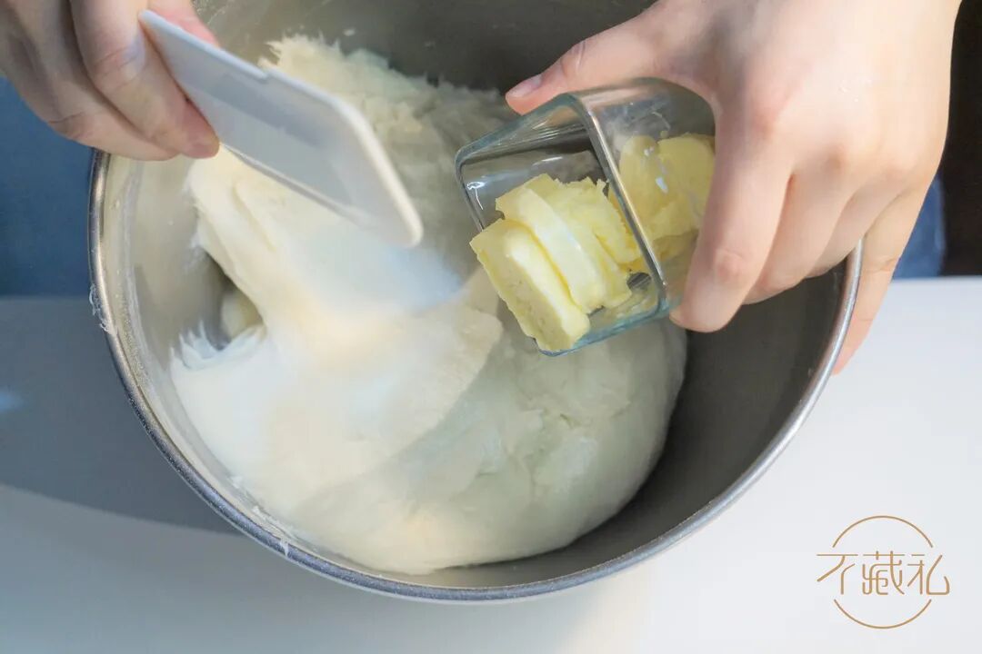 正常软化黄油:面团搅打至可以拉出粗膜(7-8成筋左右),加入酵母溶液和黄油,慢速搅拌3分钟,快速3分钟搅拌至完全扩展。