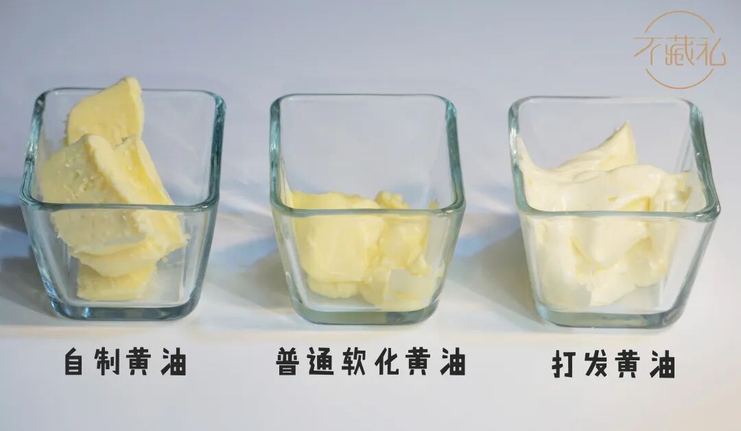 3.准备三种无盐黄油:自制黄油、普通软化黄油、打发黄油、。