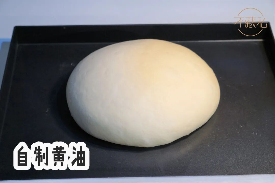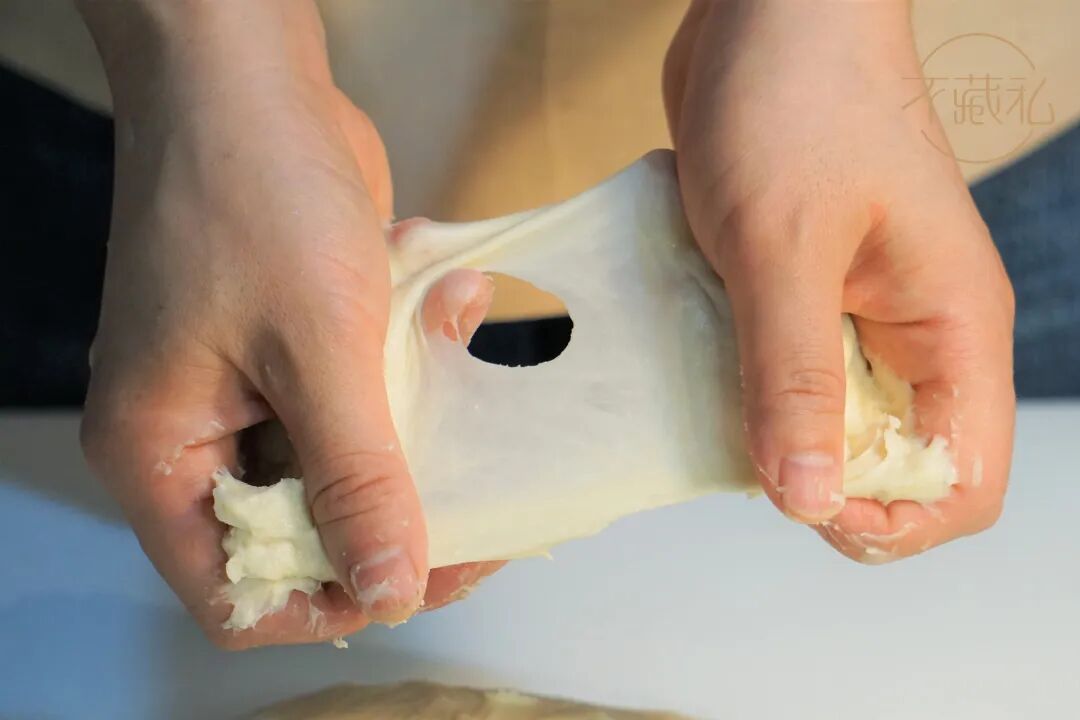 自制黄油:面团搅打至可以拉出粗膜(7-8成筋左右),加入酵母溶液和黄油后,慢速搅拌3分钟,快速3分钟搅拌至完全扩展。