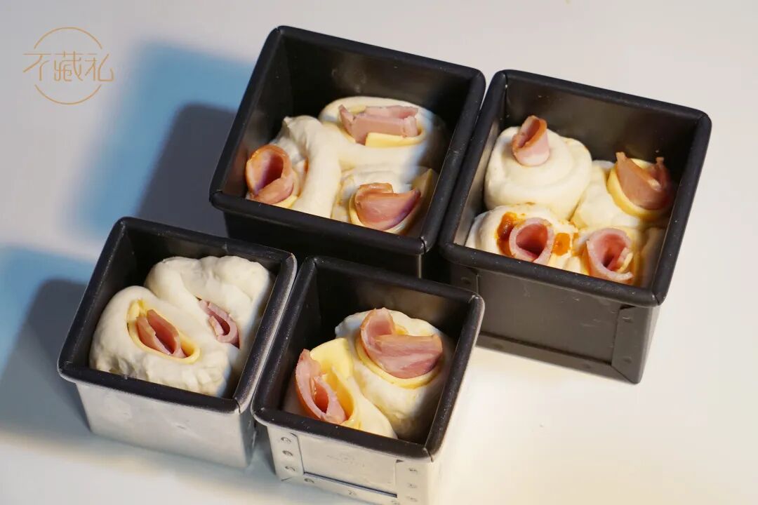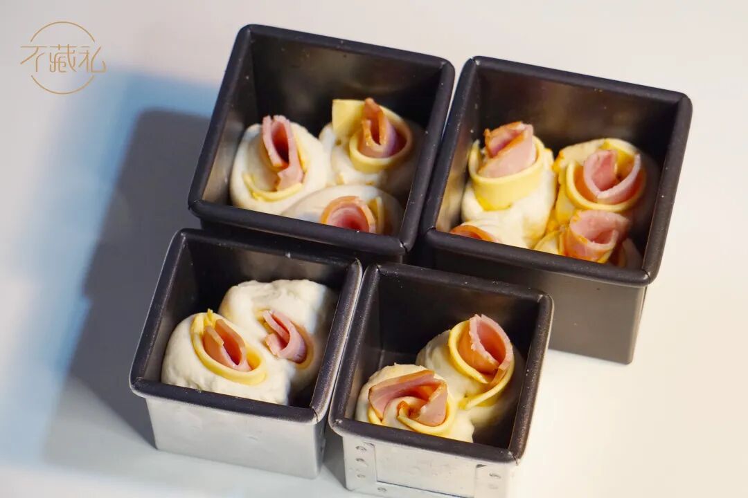 4.卷好的面团,对半切开为一组,放入模具中。醒发30分至模具8分满。放入预热好的烤箱,以上火210℃下火200℃,烘烤12分钟。
