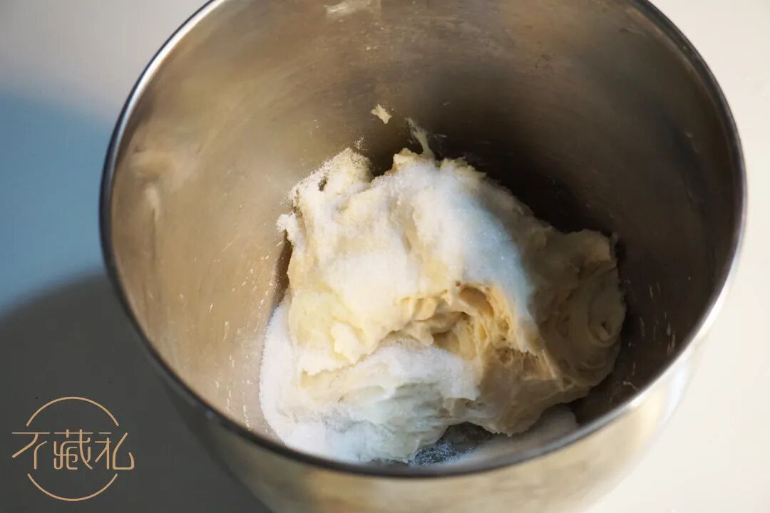 ▷ 将中种面团和砂糖先进行搅拌,搅拌均匀后再加入除黄油以外的其它材料,搅拌至5成筋,再加入黄油搅拌至完全扩展。(中种面团搅拌时间会略短一些,需要自己灵活掌控,切勿打过)