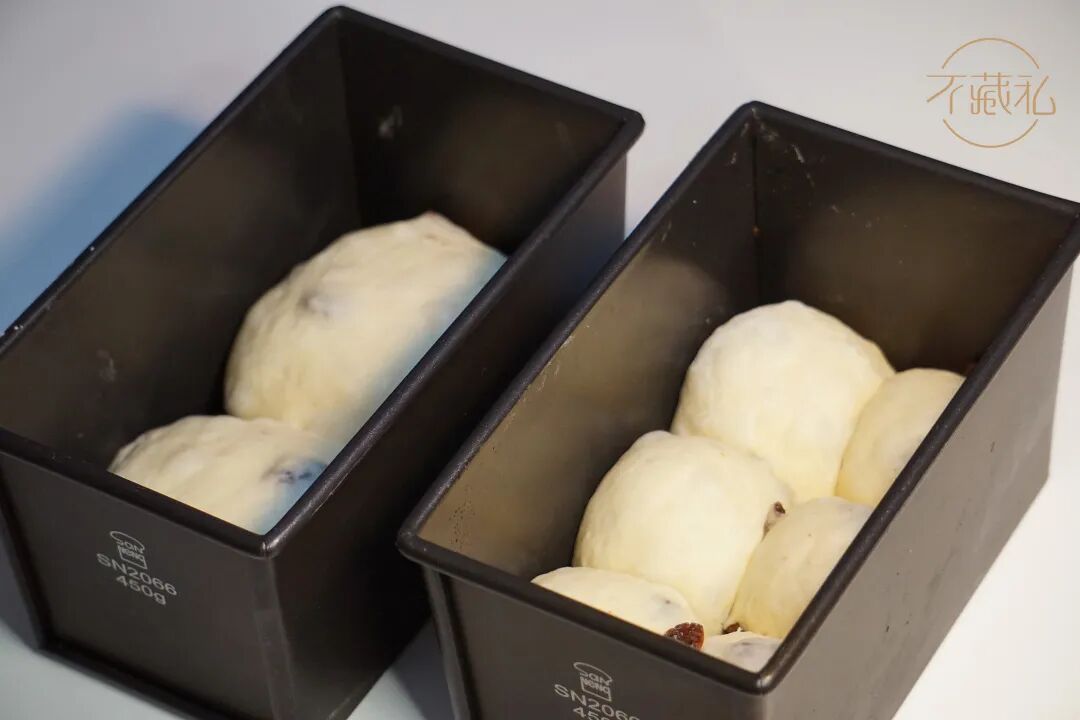6.把松弛后的面团搓圆放进吐司盒。450g吐司盒可做6个100g的面团或2个250g的面团。最后发酵65分钟至模具8.5分满。