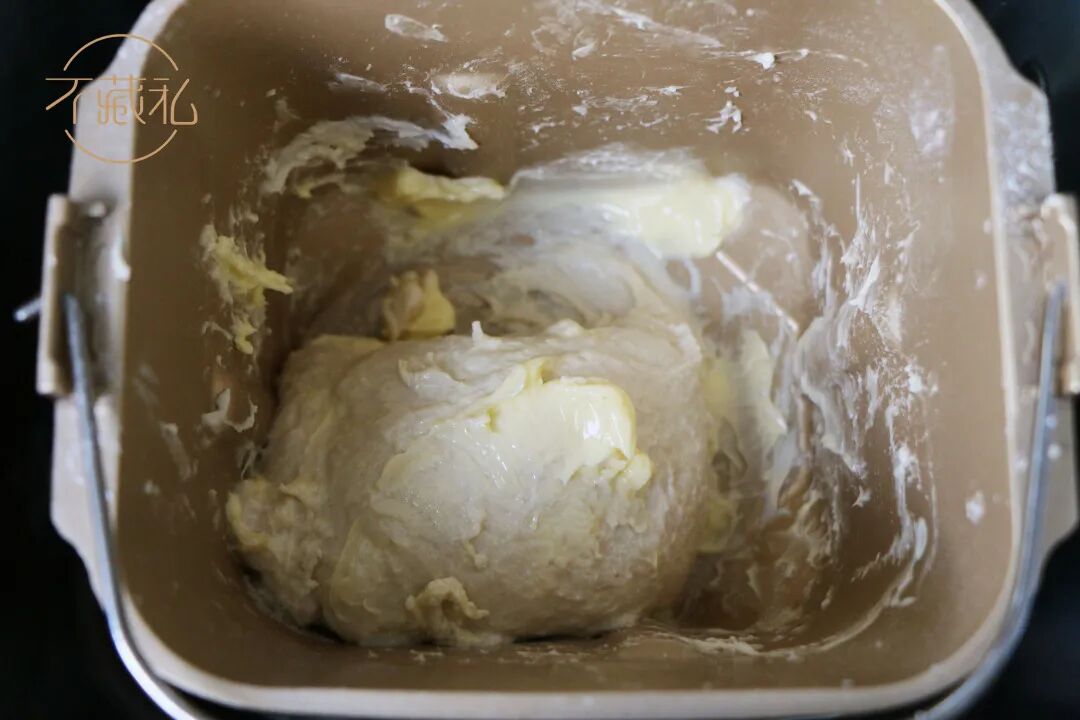 3.然后加入软化黄油,打到程序结束。期间有需要的话,也利用好软刮刀哦。如果你的面包机功率大一些,可能提前2-3分钟就结束了,所以打面是真的看面团状态,而非时间。