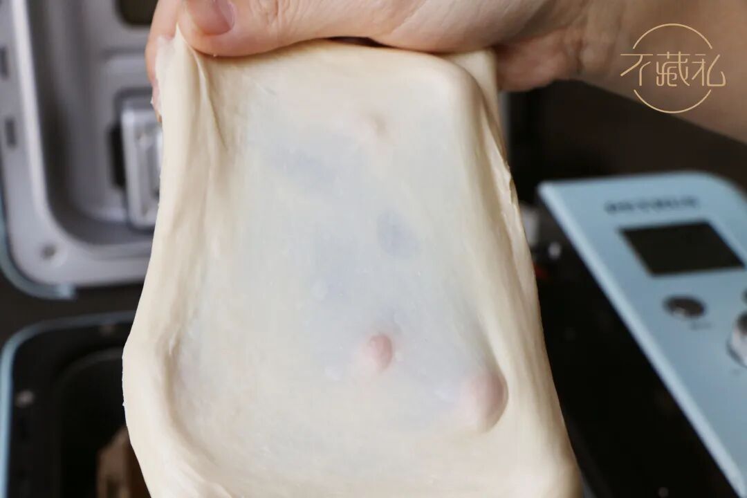 4.检查一下面筋,这个状态就很合适了,光滑、透亮、有一定的韧劲。