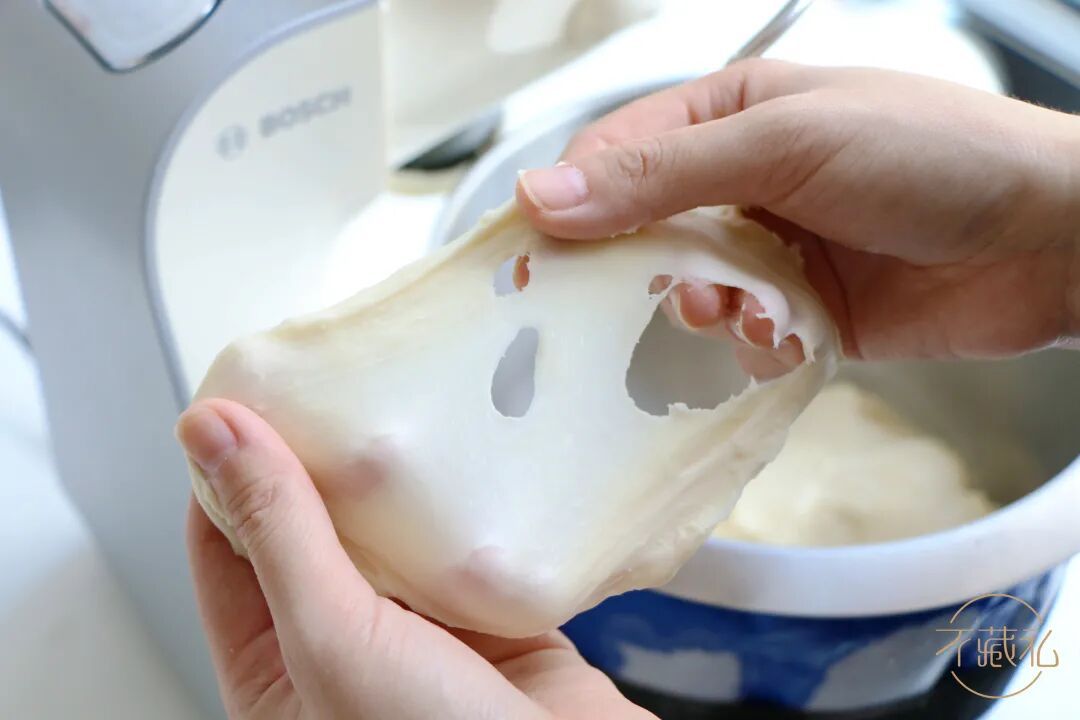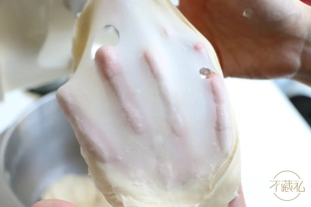 3.转快速揉面约4-5分钟,直到面团能撑出厚膜,破洞边缘呈锯齿状。
